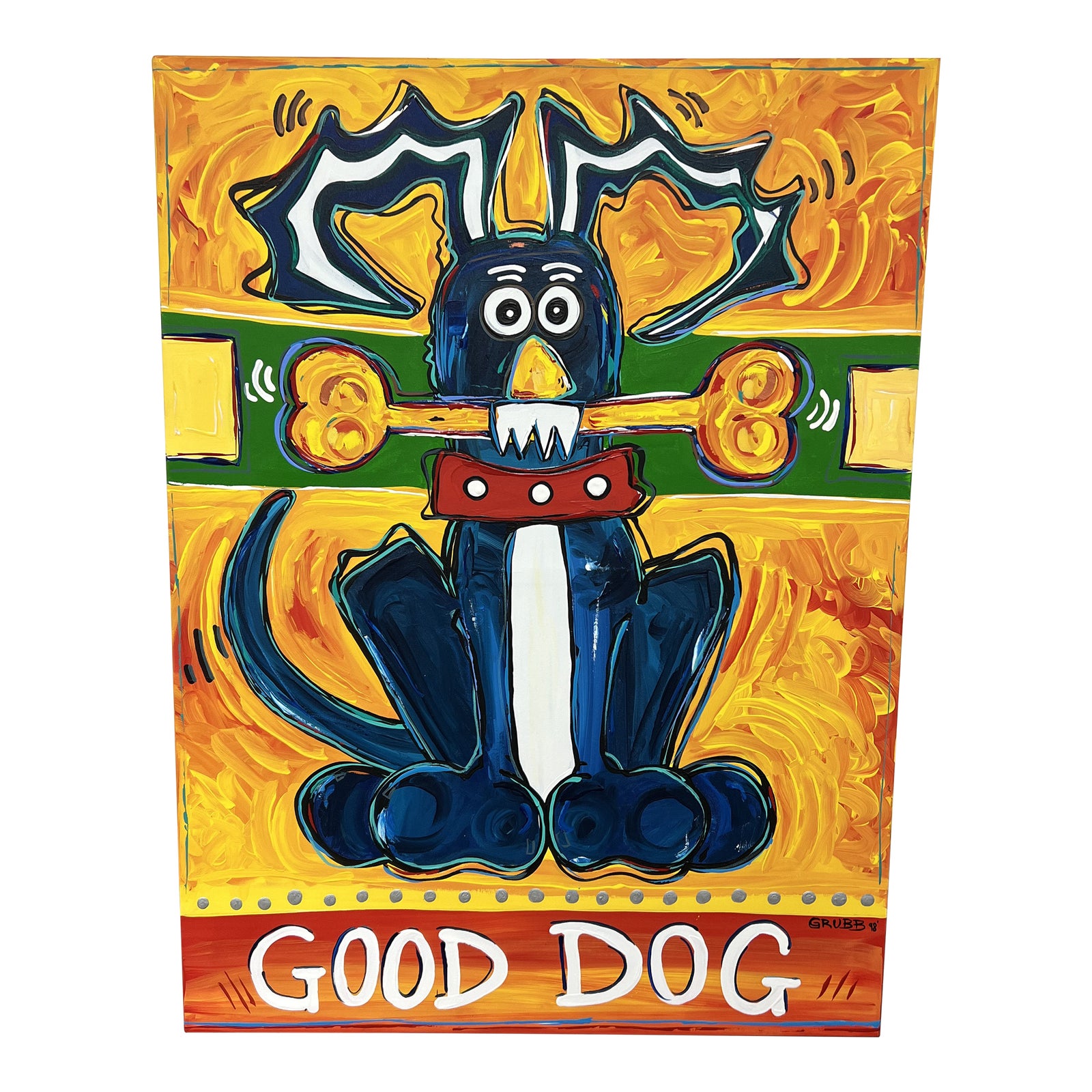 Design Plus Gallery presents the Lisa Grubb 1998 Original Acrylic on Canvas: “Good Dog”. A blue dog sits with bone in mouth and looks towards the art viewer. The painting is made with bright, playful colors and feels like a new cartoon character brought to life. Minor wear from use; painting is in good condition.