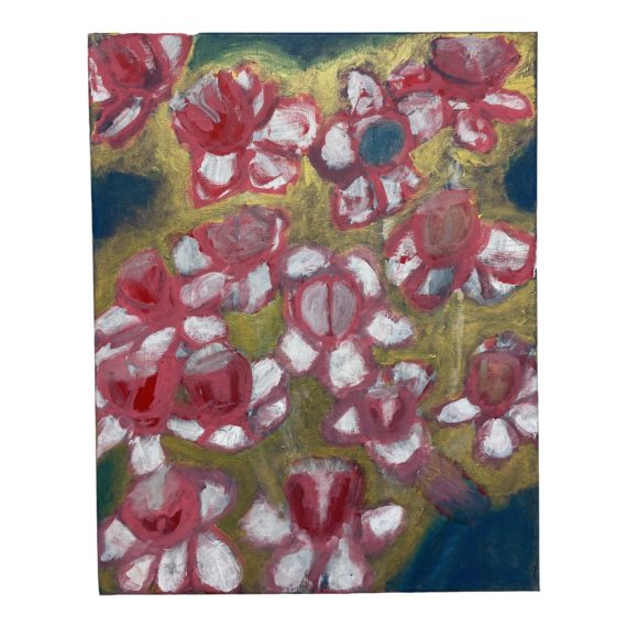 Design Plus Gallery presents a Littleton S. Irby “Magnolia’s Dancing” Original Acrylic Painting. Signed and dated by the artist on the back of the canvas. Impressionistic painting shows an an aggregation of vibrant ivory and ruby red magnolias against a bronze + teal backdrop.