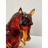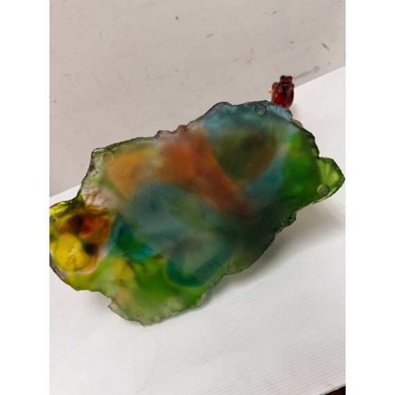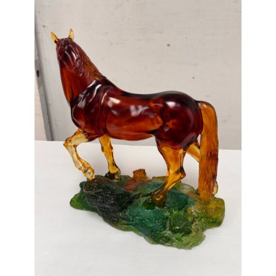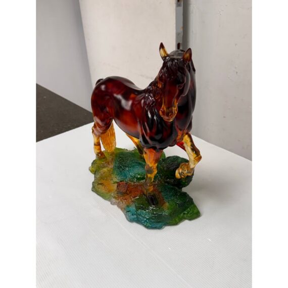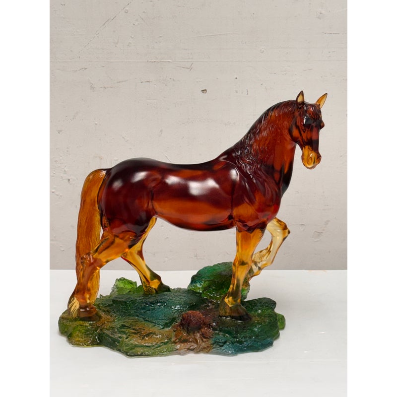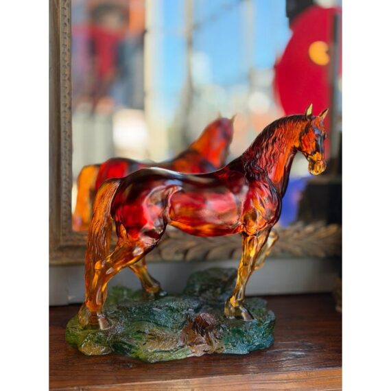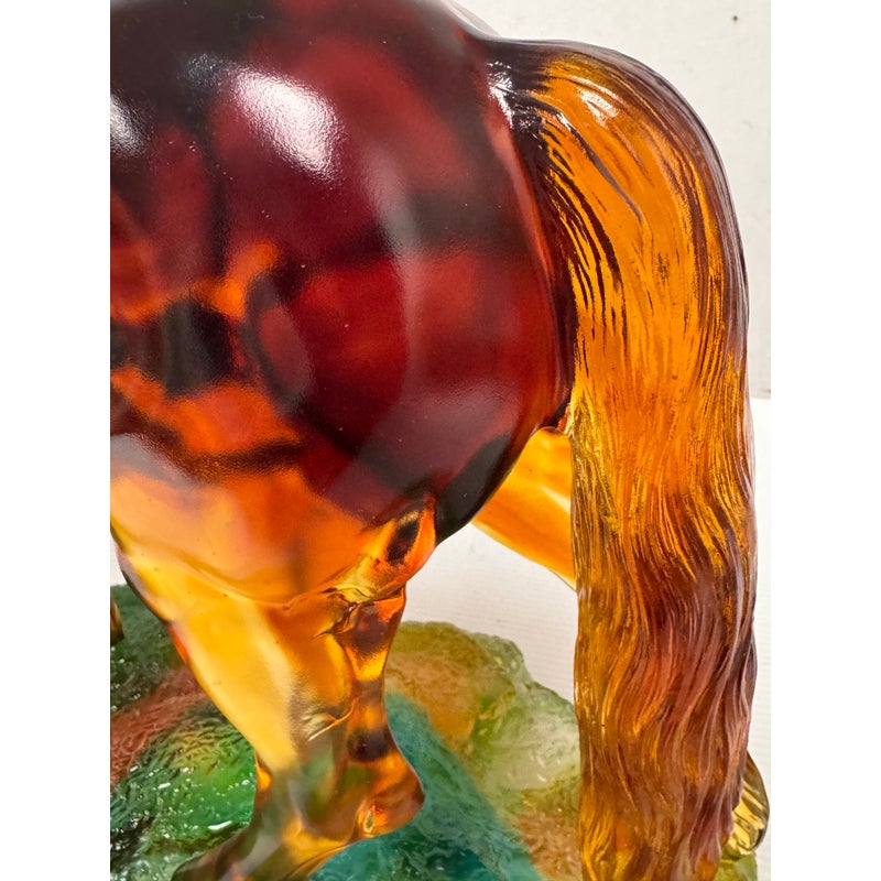 Design Plus Gallery presents a Crystal Handcrafted Horse Sculpture by LiuLi. Liuli crystal refers to a beautiful, ancient Chinese art form of colored glass, handcrafted into intricate sculptures. This glass horse figurine has a poised stance and fluid form. Rendered in translucent Fire and Amber tones, this sculptural accent captures movement through its arched neck, flowing mane, and lifted foreleg. The figure stands atop a textured base in green and earth hues, adding visual depth and contrast. Ideal as a display object for shelves, consoles, or curio cabinets, this piece brings character and artistry to both traditional and contemporary interiors. This is a discontinued model with the brand. In good condition, minimal wear from usage.