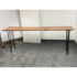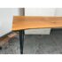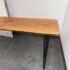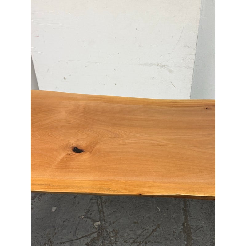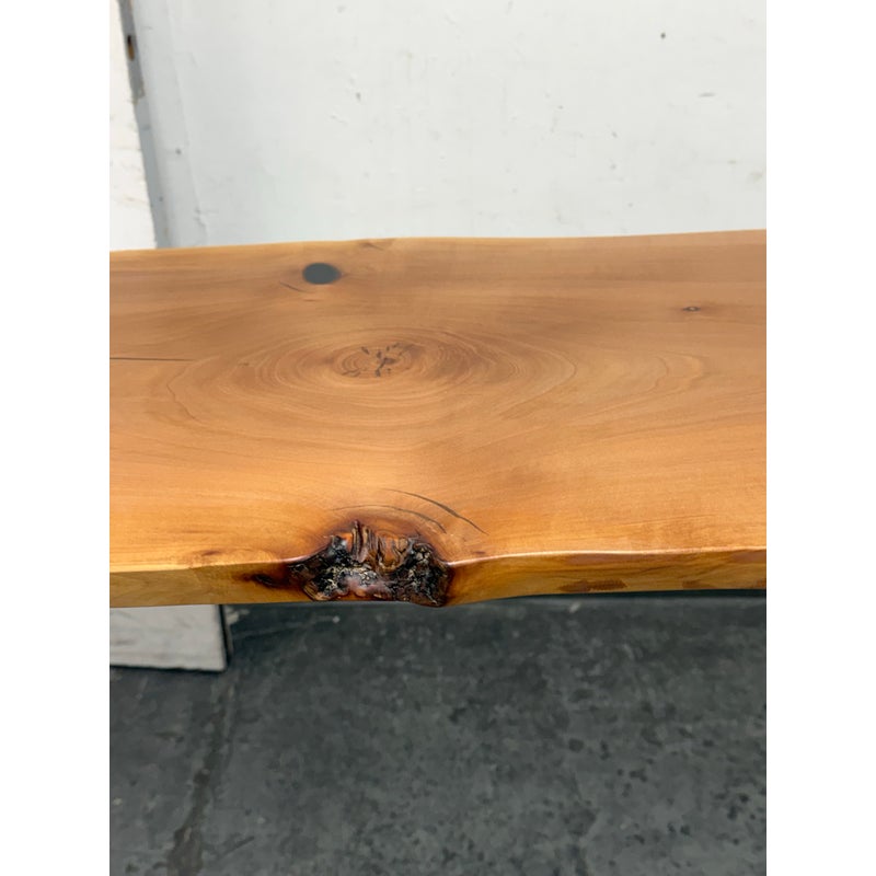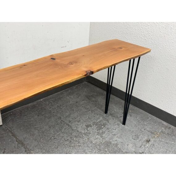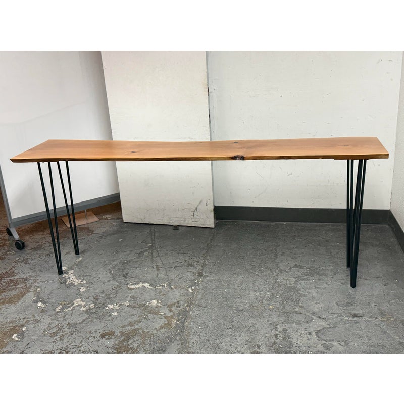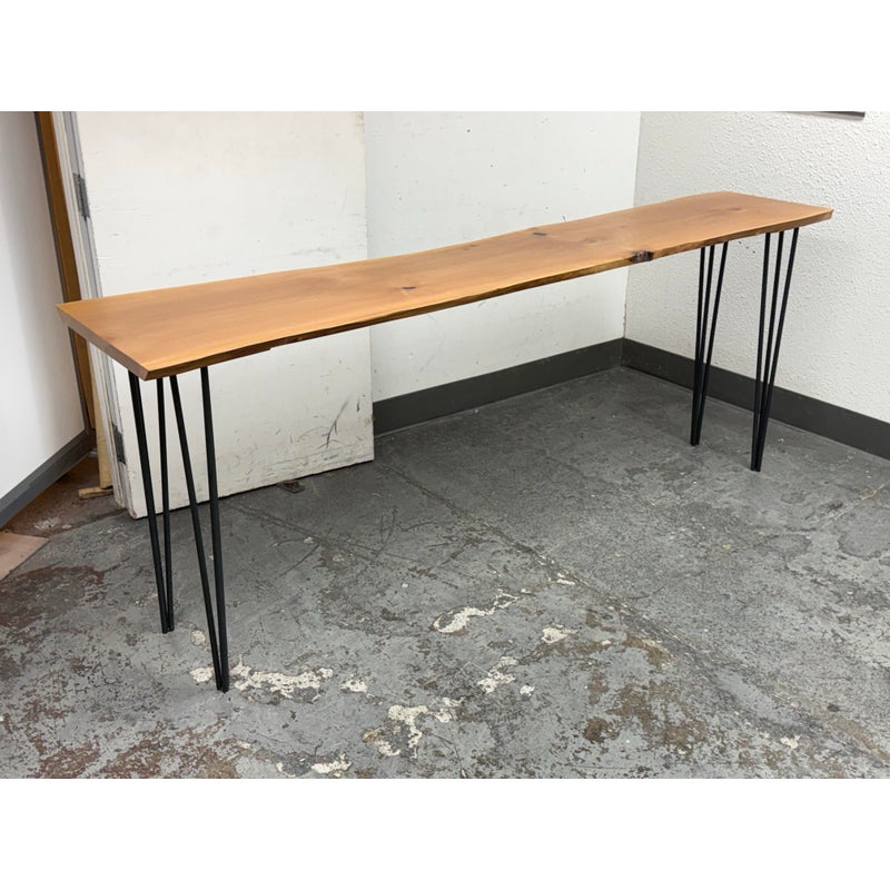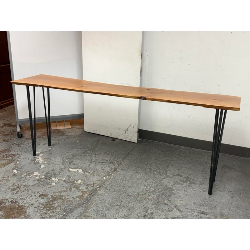 Design Plus Gallery presents a Custom Design Live Edge Console Table. The table has been made from stunning Madrone wood. The table has a narrow yet tall profile, making it ideal as a counter height workspace, standing desk, or a unique dining table for smaller spaces. The natural raw edge of the Madrone wood slab brings an organic charm. Its smooth satin finish preserves the wood’s character while adding a subtle sheen with its protection. Supported by contemporary blackened iron hairpin legs making this table is both sturdy and visually light, blending industrial flair with nature’s artistry. Its slim silhouette makes it perfect for entryways, behind sofas, or as a standing desk in a home office, while the ample height makes it comfortable for use with counter stools or standing. In good condition, visible and minimal wear.