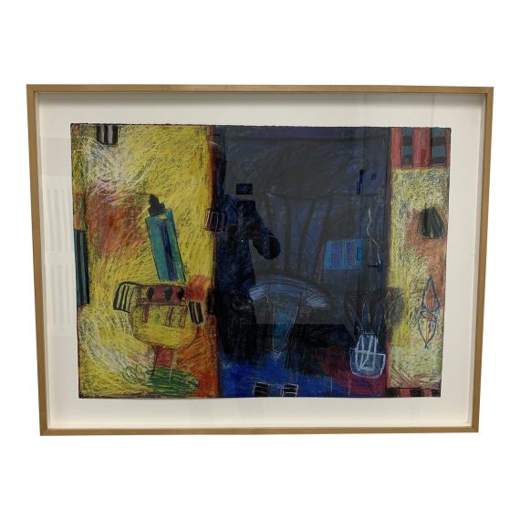 Design Plus Gallery presents an Original Pastel+ Paper Artwork by Livia Stein. The artwork is titled DR592 “The Vessels” and was made in 1991. Floating frame lets the edge of the original artwork be free within the shadow box like framing. Custom framed in a light natural wood tone. Minor wear on frame.
