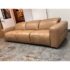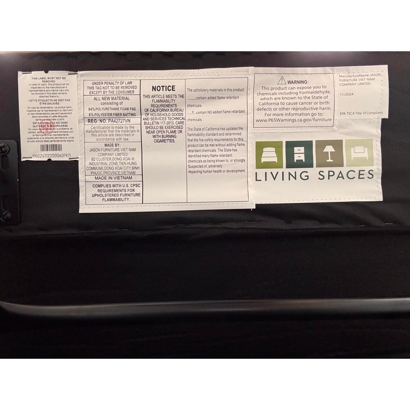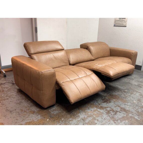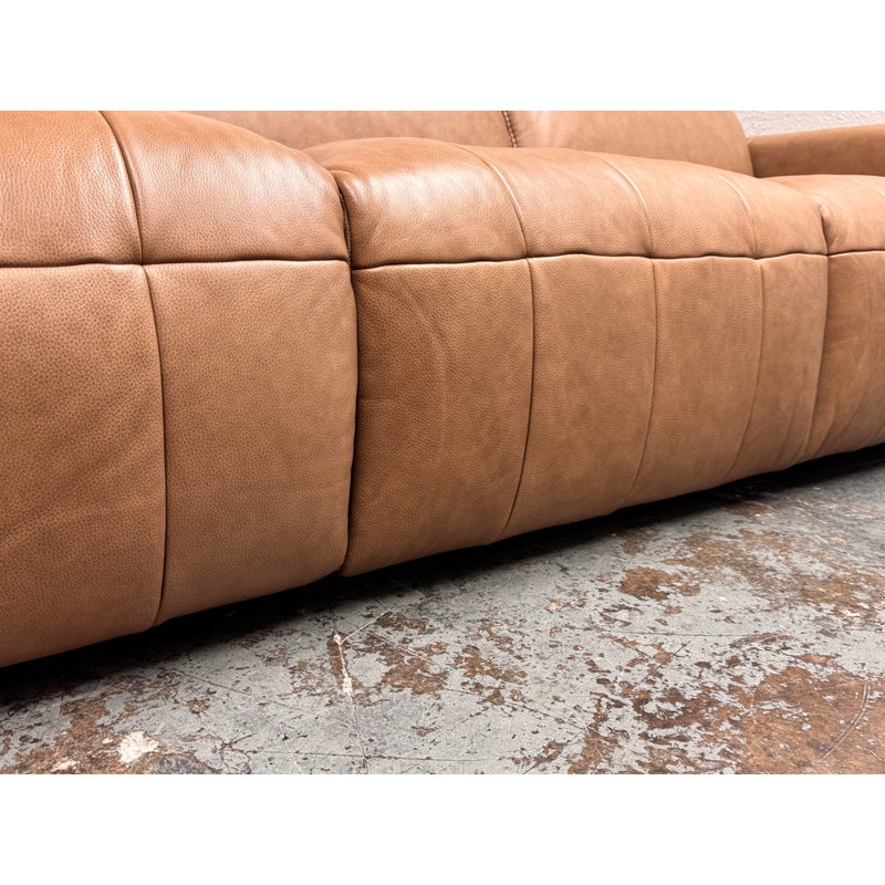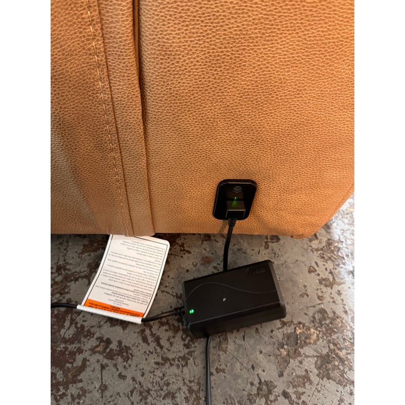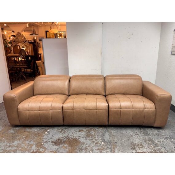 Design Plus Gallery presents the Miles Power Recliner Sofa from Living Spaces. The set of seats is upholstered in leather and includes a left-arm power recliner, armless power recliner, and right-arm power recliner. The style offers broad track arms, plush back cushions, and paneled seat detailing to give the piece a contemporary profile with a modernized, streamlined look. Power reclining seats and power headrests offer adjustable support, while integrated USB charging adds modern convenience. It is in good condition with visible and minimal wear from usage.