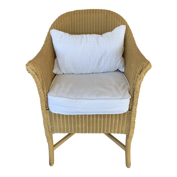 Design Plus Gallery presents a Vintage Wicker Look Arm Chair, British made by W. Lusty & Sons (Lloyd Looms). Perfect for indoors or out, the classic style is ageless. Seat and back cushions included.