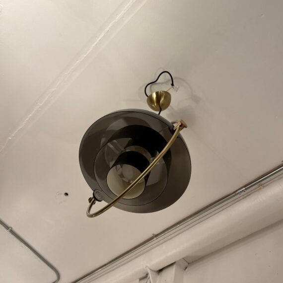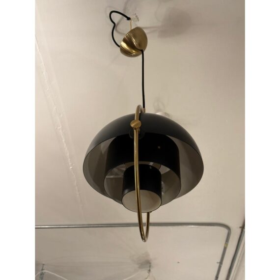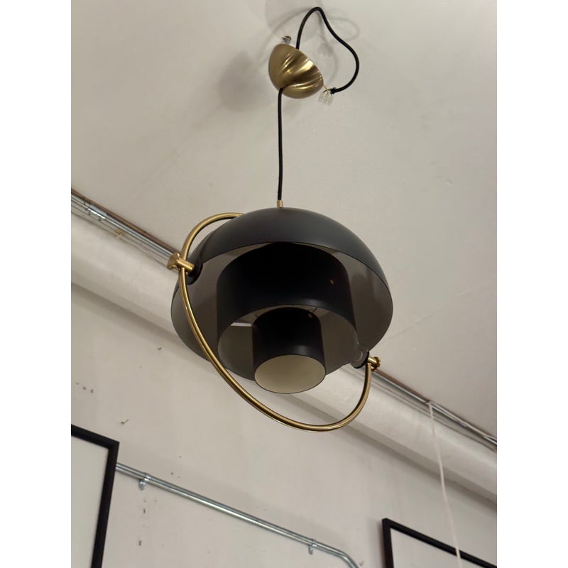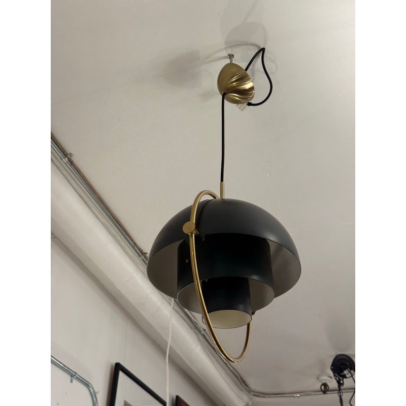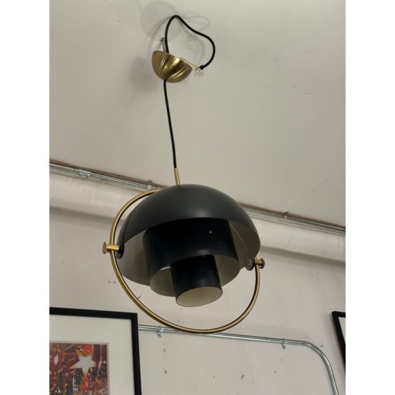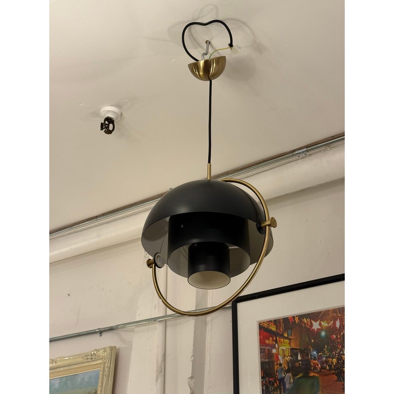 Design Plus Gallery presents a Multi-Lite Pendant by Louis Weisdorf for Gubi. First drawn in 1972 by Louis Weisdorf, this Gubi pendant embodies classic Danish design with its characteristic geometric form and mobile shades that allow for a personalized lighting installation. By individually rotating the shades, the Multi-Lite Pendant can be transformed into multiple combinations where the light can be directed upwards, downwards, or to an asymmetrical accent light. Simply stunning in black with brass hardware, this pendant is also in their medium size. It is in good condition, minimal wear from usage. Made in Denmark.