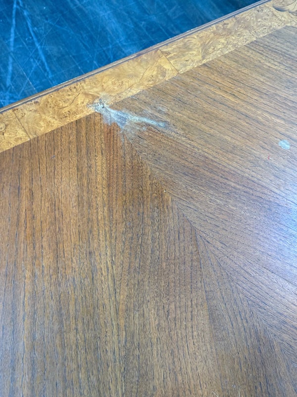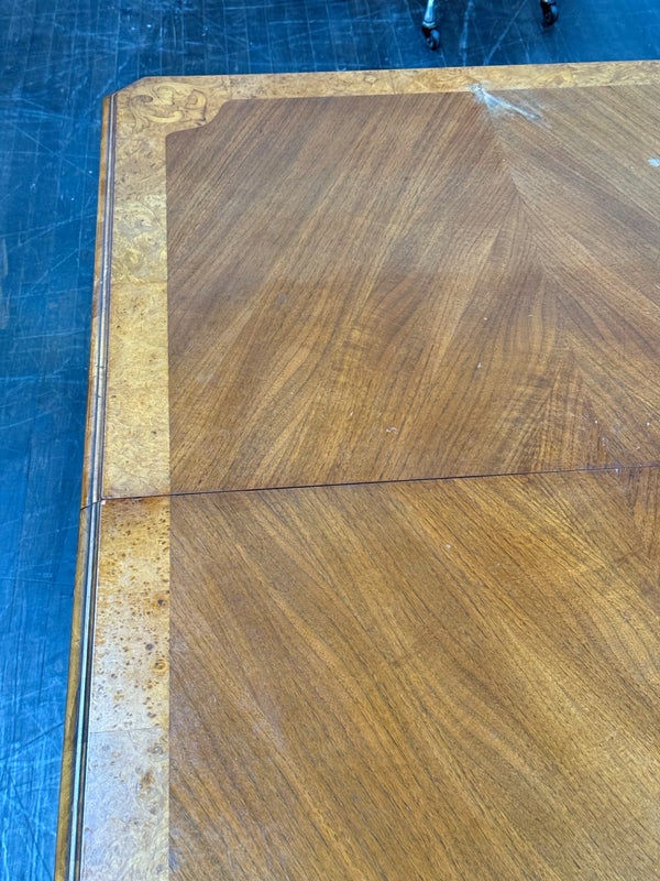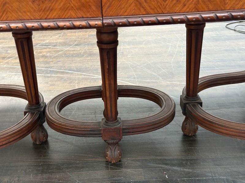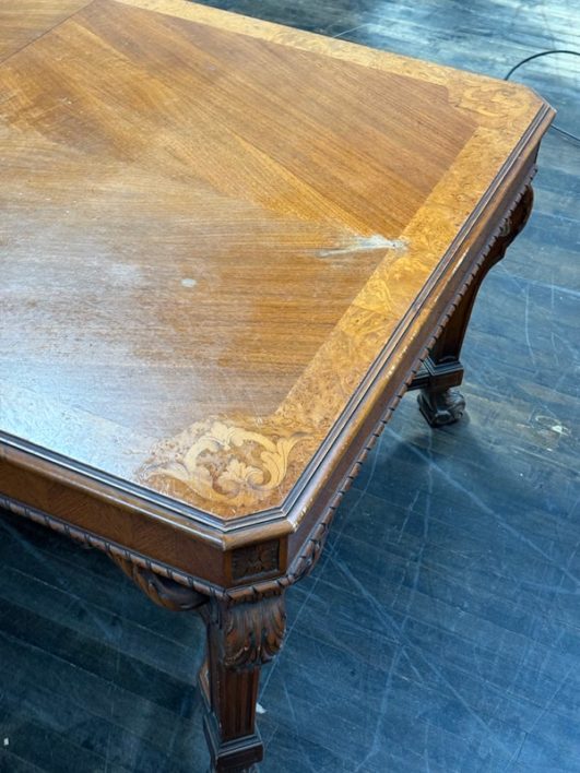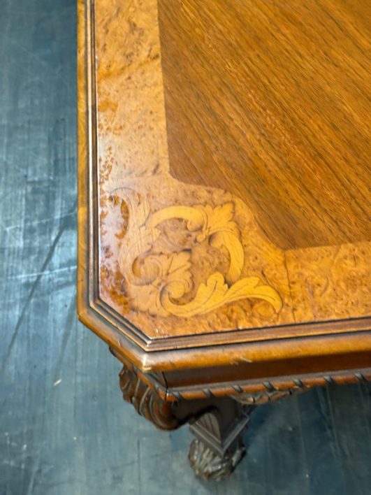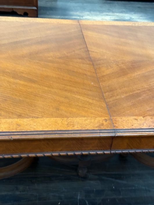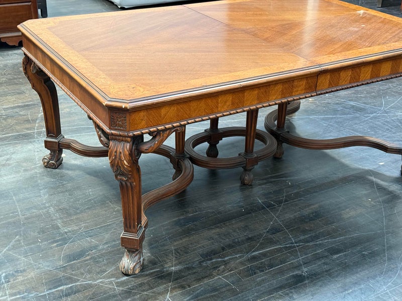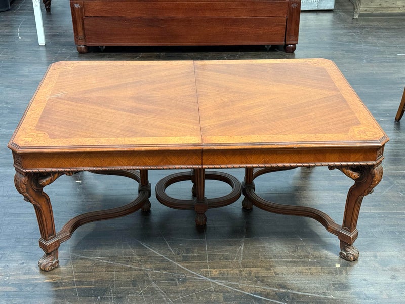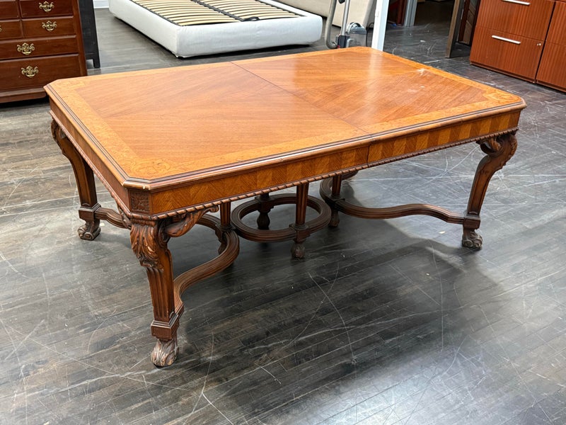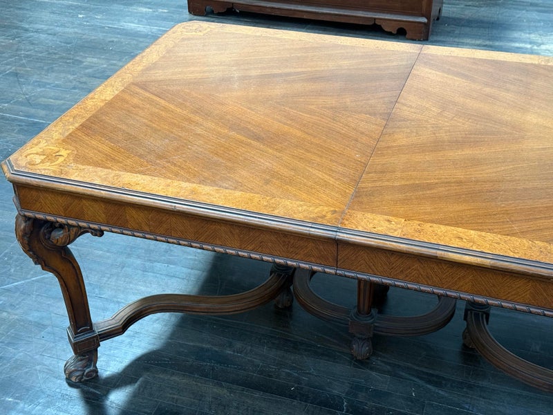 Design Plus Gallery presents an Inlaid Antique Dining Table. French Provincial styling is what this table is inspired by, that and Louis XV attributes. Visible wear is present to the table that is considered consistent with its antique age. Does not come with table extensions.