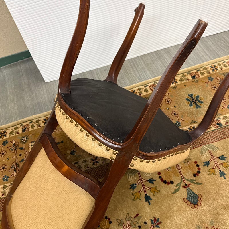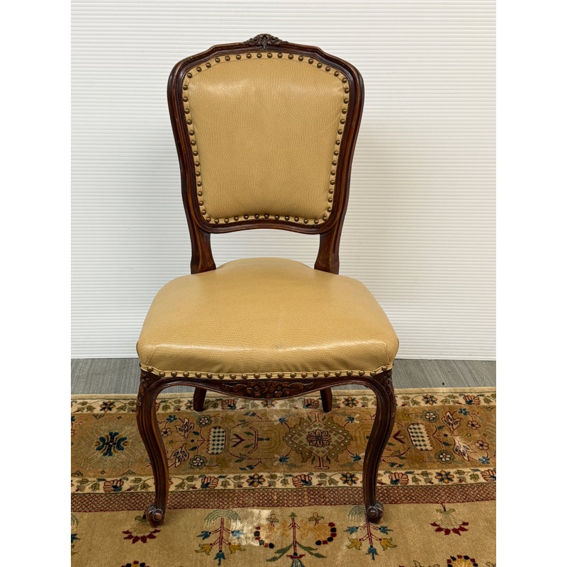 Design Plus Gallery presents a Louis XV Side Chair. This refined chair is similar to Rococo style with its intimate and curvilinear design. It has slender cabriole legs, asymmetrical floral carvings, and a smaller, more comfortable size compared to earlier styles. It is defined by its sinuous lines, cartouche-shaped backrest, serpentine seat rails, and carved “escargot” or scroll feet. The sumptuous tan ostrich leather has a nail head trim around all wood to connect and also protect the textile from distress from use. It is in good condition with minimal signs of visible wear for its usage.