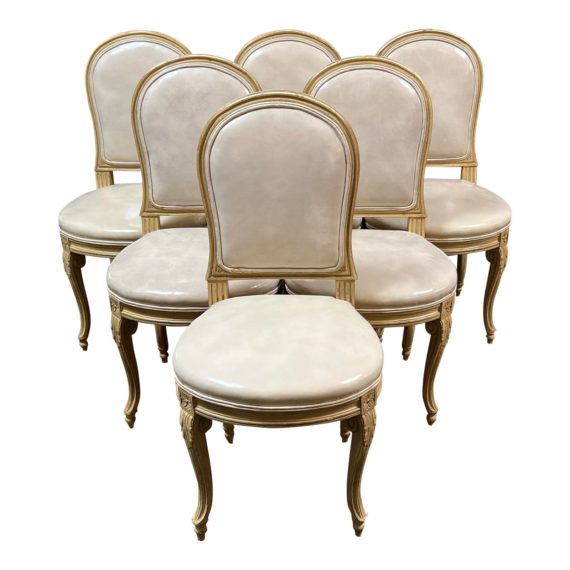 Design Plus Gallery presents a Set of Six Louis XV Style French Dining Chairs. The frames are constructed with wood and given an antiqued cream finish. The seats and backs are upholstered with a cream leather. The legs have cabriole curves and feature floral, acanthus and scrollwork accents. Minor wear from age and use; chairs are in good condition. Made in France.