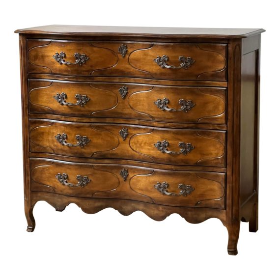 Design Plus Gallery presents a Louis XV Style High Boy Four Drawer Dresser. It has beautiful scalloped edging on the below the bottom front and sides + an undulating, curved design on the front edge of the frame. The pulls are iron forged and flanked , with lovely finesse to them. The dresser is in good condition, wear that is consistent with age + use.