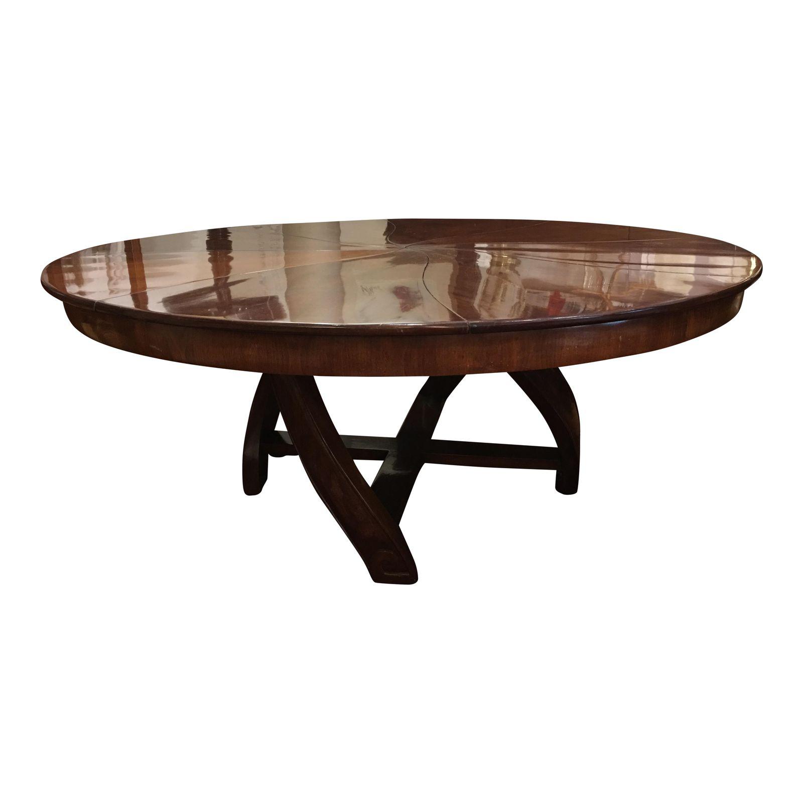 Design Plus Consignment Gallery presents a uniquely expanding dining table from L’Rossi. This traditional pedestal dining table has an expandable top that rotates before locking into place. Made from gorgeous polished walnut, it has slender legs that twist like a double helix. Expands to 88 inches in Diameter with all leaves inserted. Base os 40 inches in diameter.