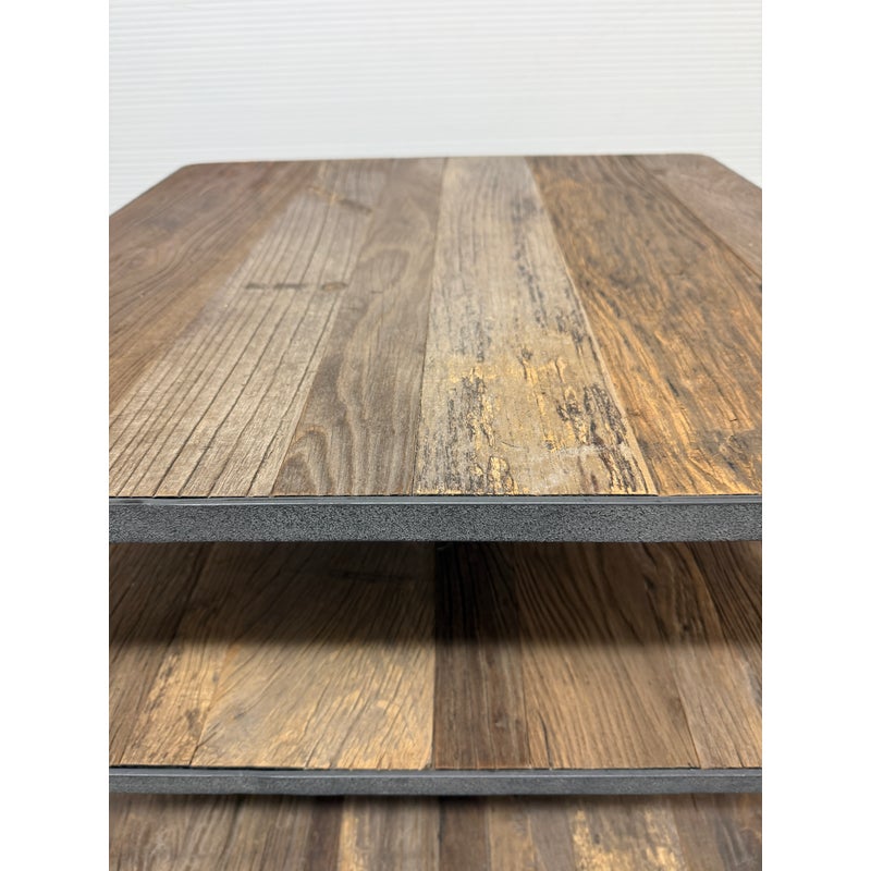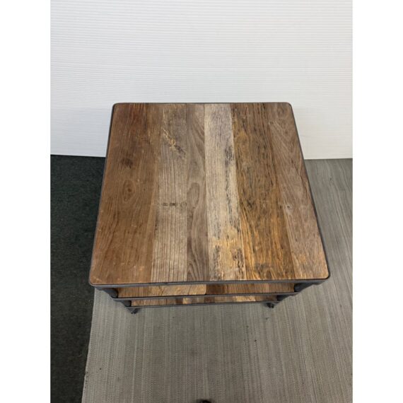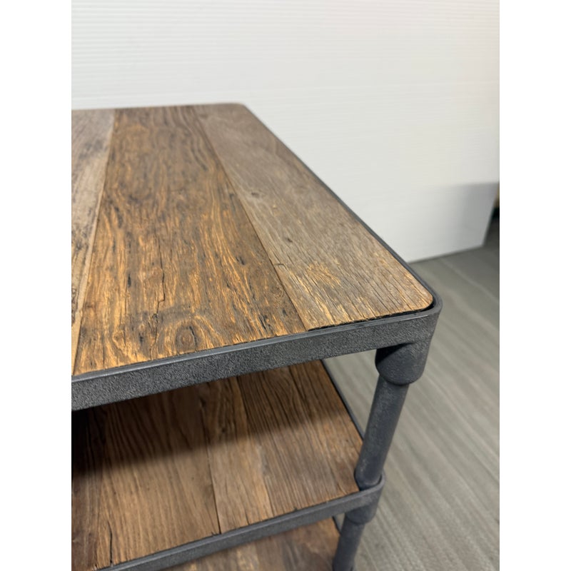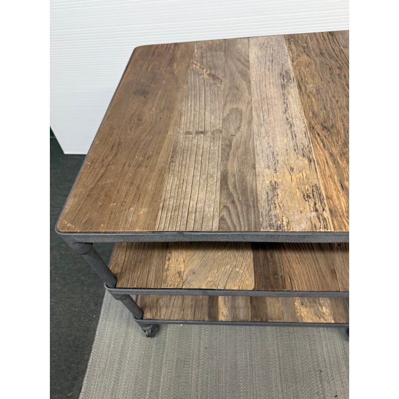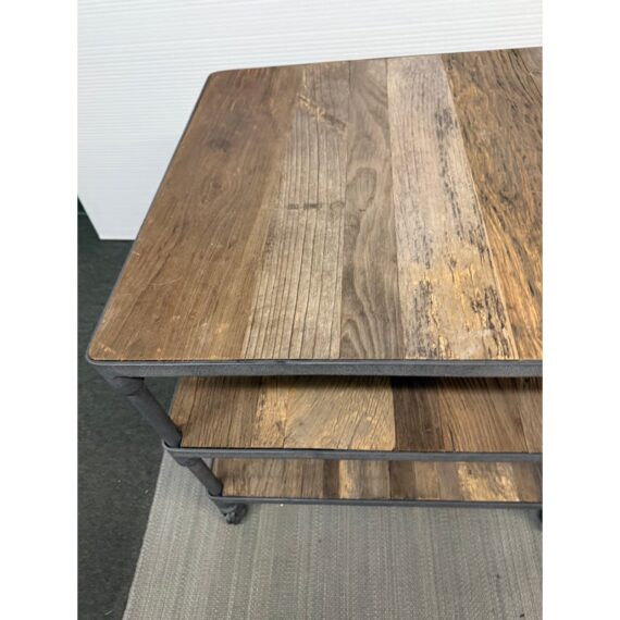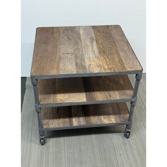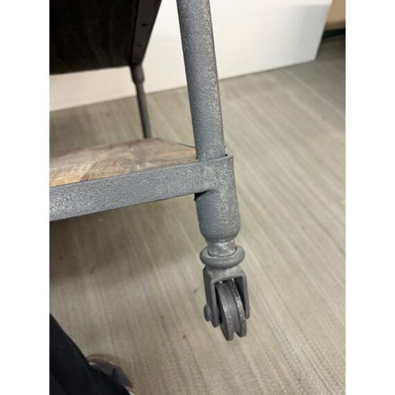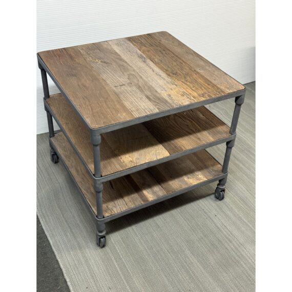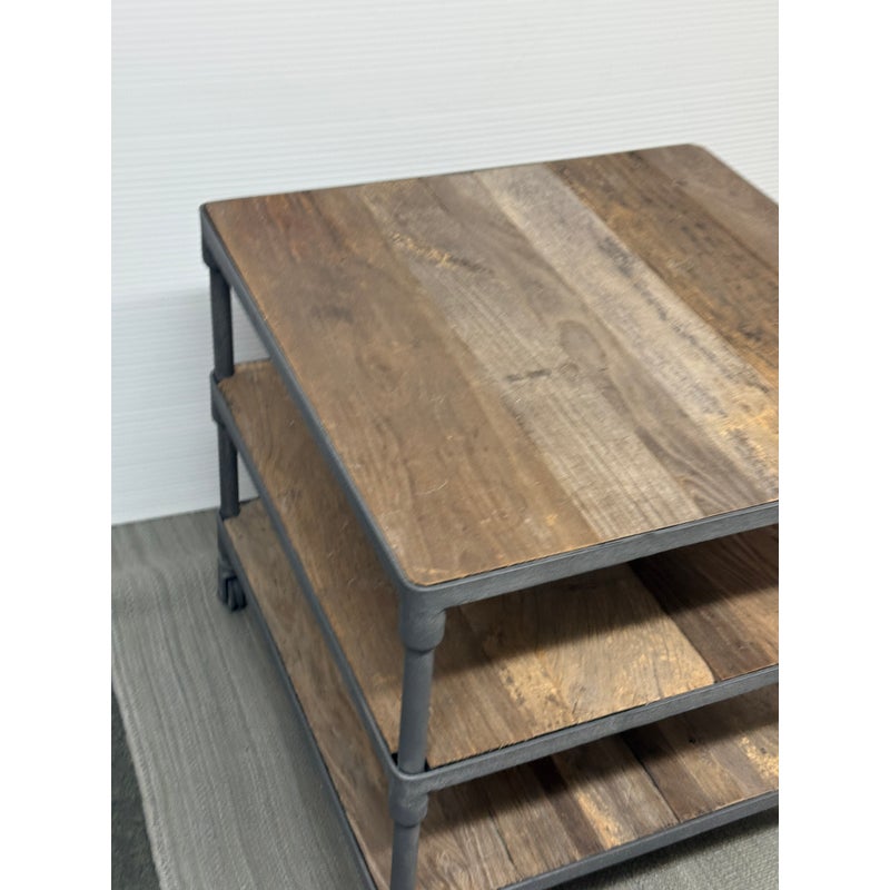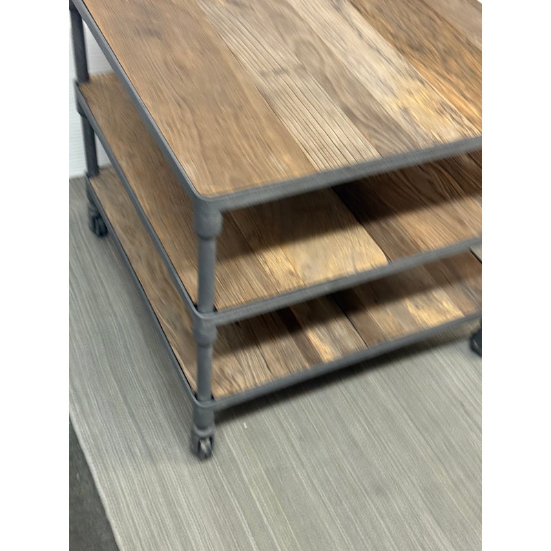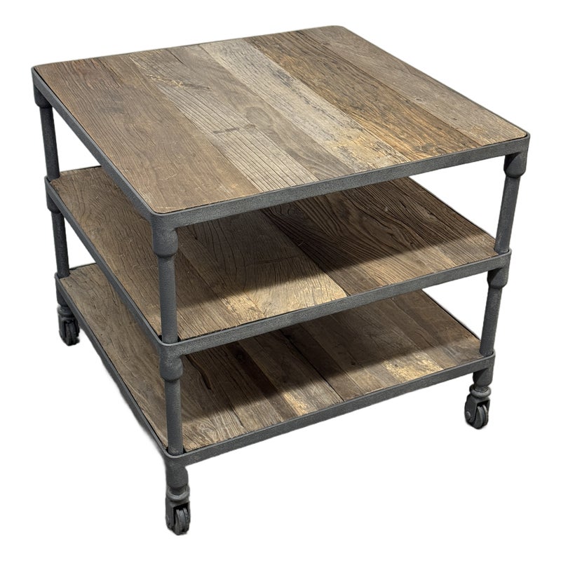 Design Plus Gallery presents a Dutch Industrial Side Table from Restoration Hardware and Designed by Luay Al Rawi’s. The side table is a pairing of antiqued elm with distressed cast metal. The materials chosen achieves “form meets function” industrial appeal to the look + style of this unit. Its steel frame is welded and that moves on small casters. Nicks and imperfections on natural elm reference age and provenance. The three tiers offer plenty of surface space for display or storage of your possessions. In good condition; distressed appearance is intentional.