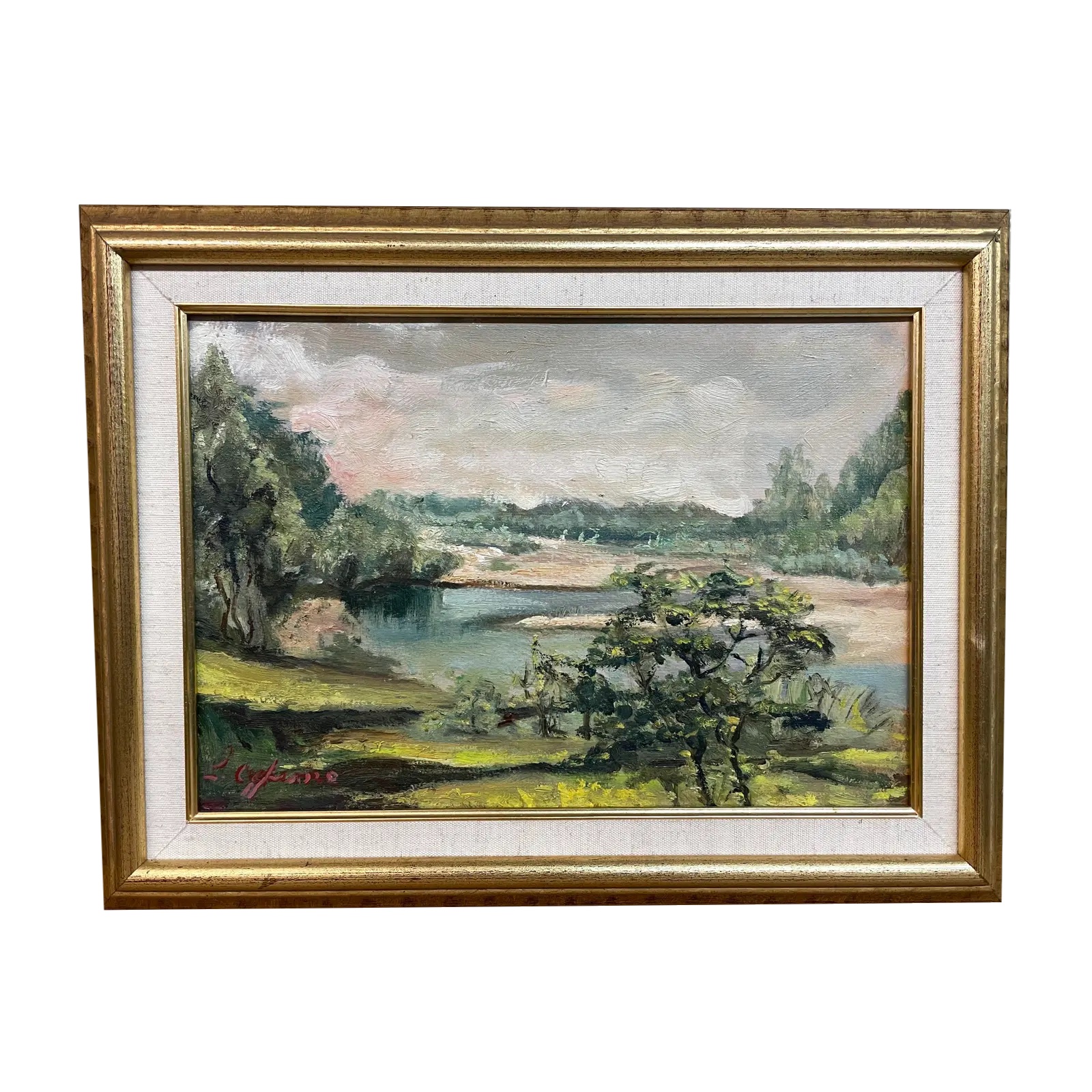 Design Plus Gallery presents an Original Painting by Luigi Aghemo (1884-1976). Custom framed in Linen and Gilt wood, the serene landscape is a gentler moment from the past. Signed by the artist, lower left.