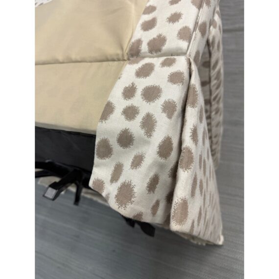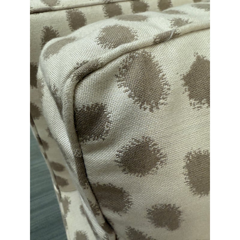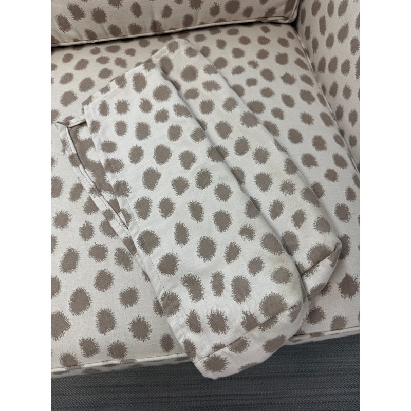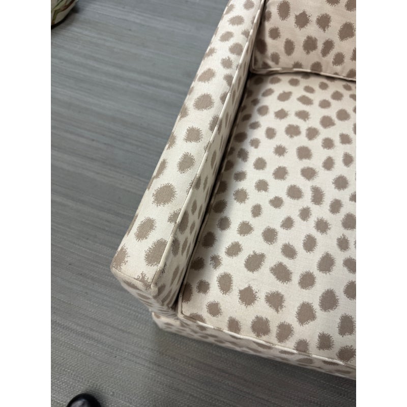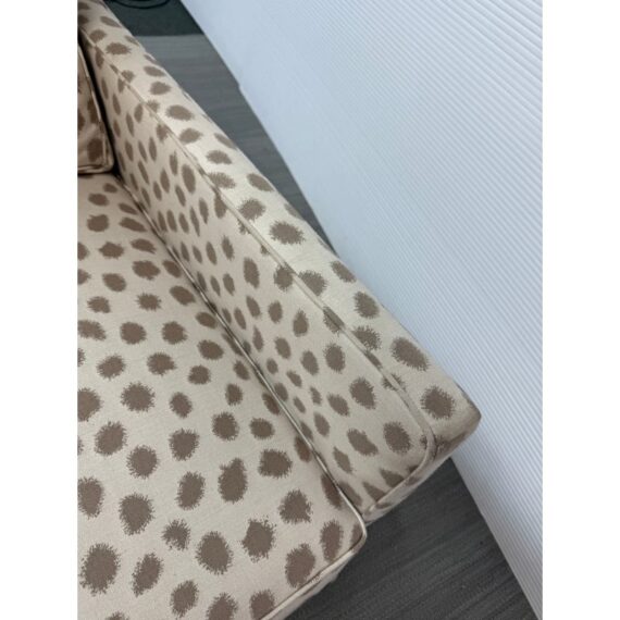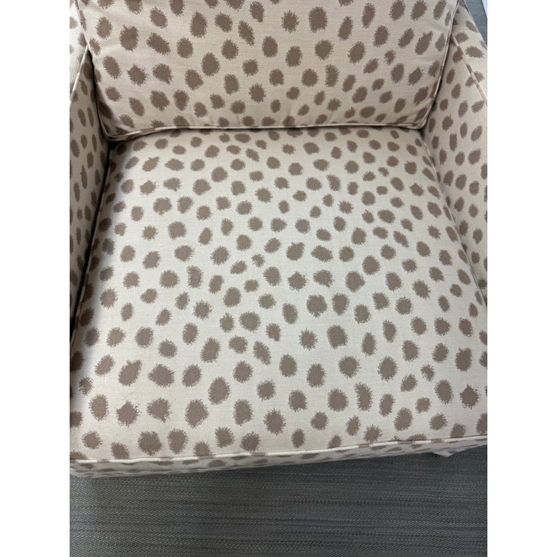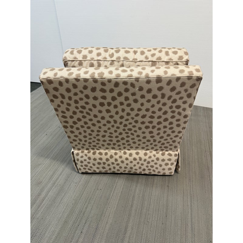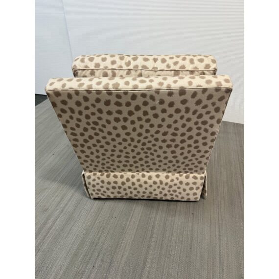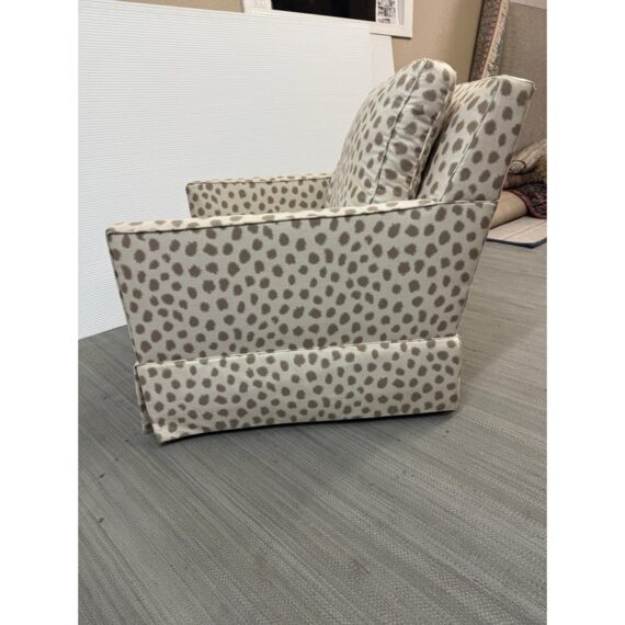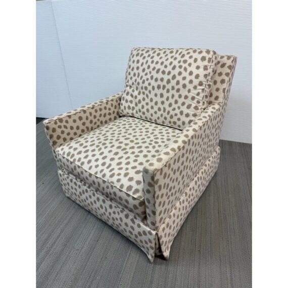 Design Plus Gallery presents the Auburn Club Swivel Chair from Miles Talbott, MT Company. Outfitted with playful polka dots and a pleated wrap-around skirt, this durable club chair grounds the room with a commanding, elegant presence. As comfortable as it is chic, it offers soft, sturdy support with an eight-way hand-tied suspension system and foam fill enveloped in feather and down-proof ticking. Little evidence of wear; condition is good. Made in the USA.