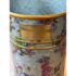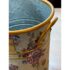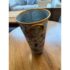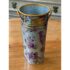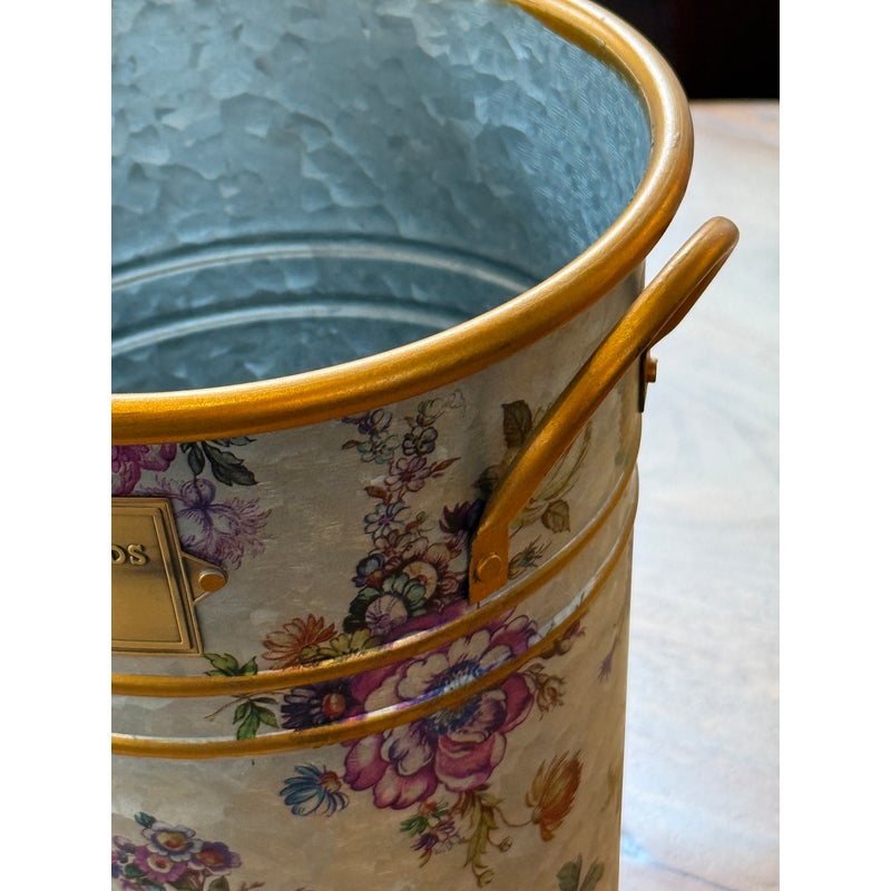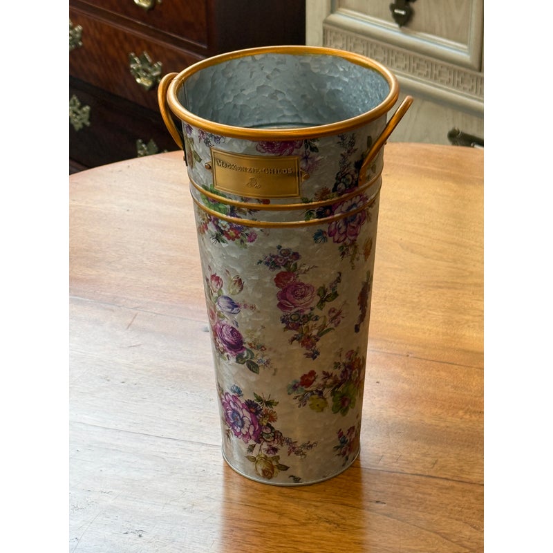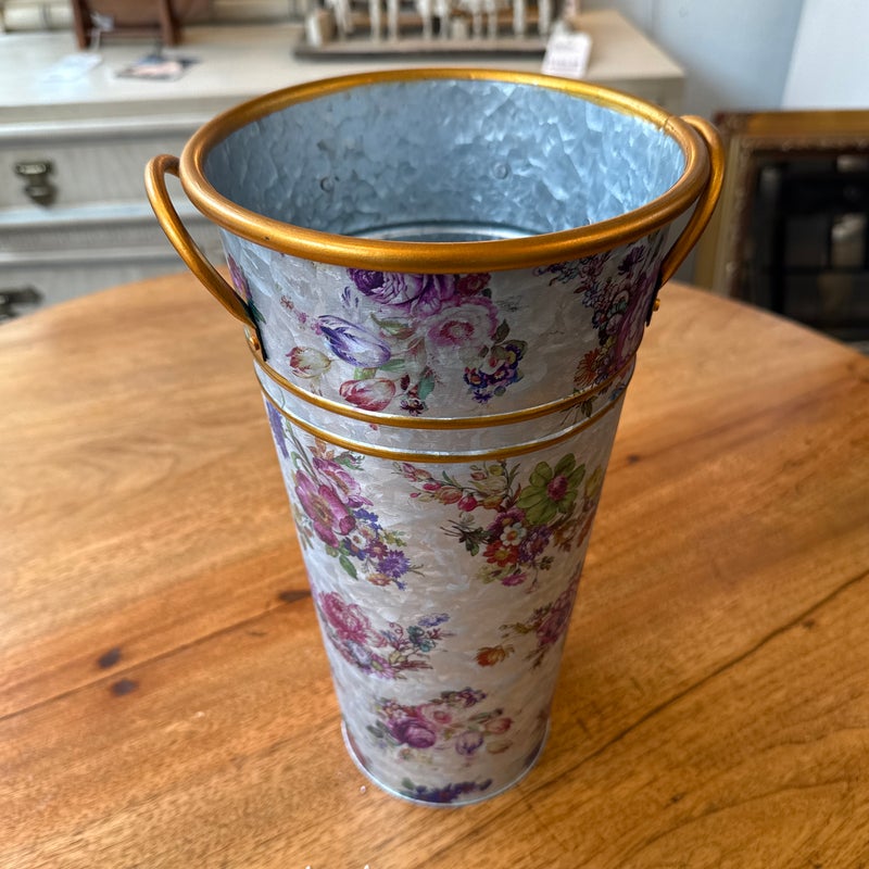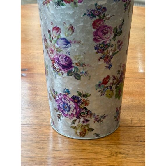 Design Plus Gallery presents a Galvanized Metal Flower Market Vase from Mackenzie Childs. This tall cylindrical vase is made of galvanized metal with an allover floral print in shades of purple, pink, red, blue, and green. The piece is accented with brass-tone rim detailing, side handles, and a front plaque bearing the Mackenzie Childs name. Its tapered profile and textured metallic surface give it a distinctive decorative character true to the Flower Market collection. It is in good condition with visible and minimal wear from usage.