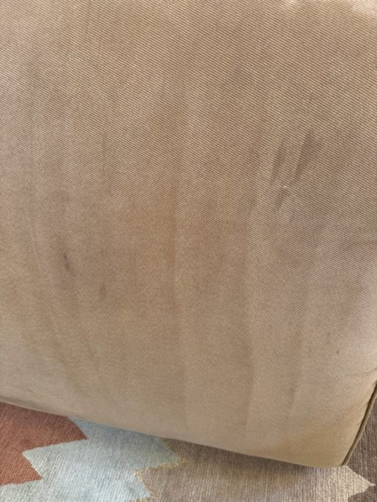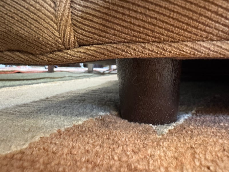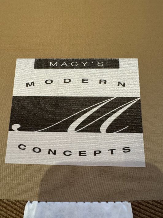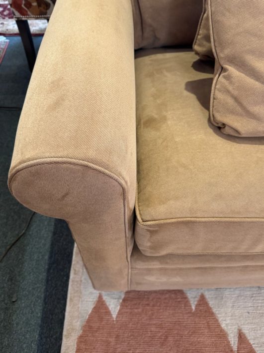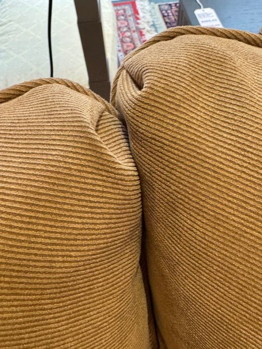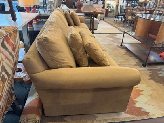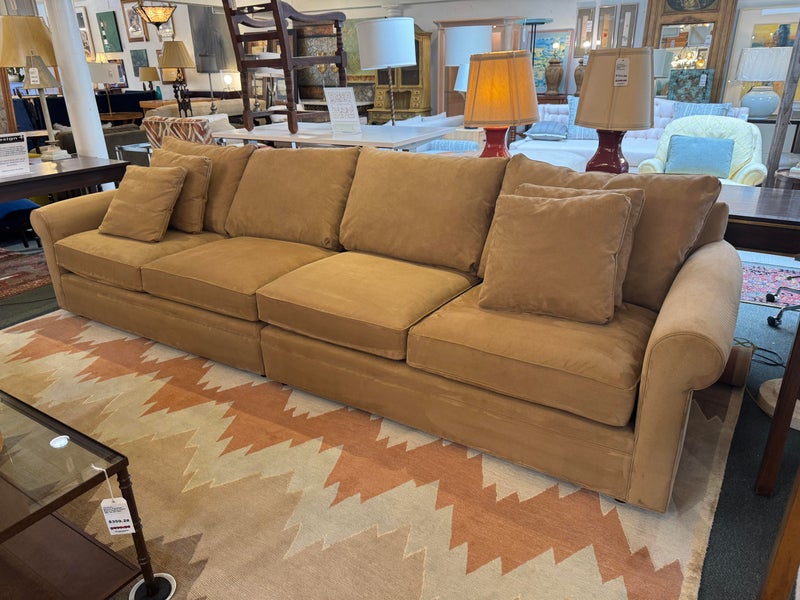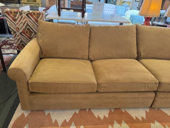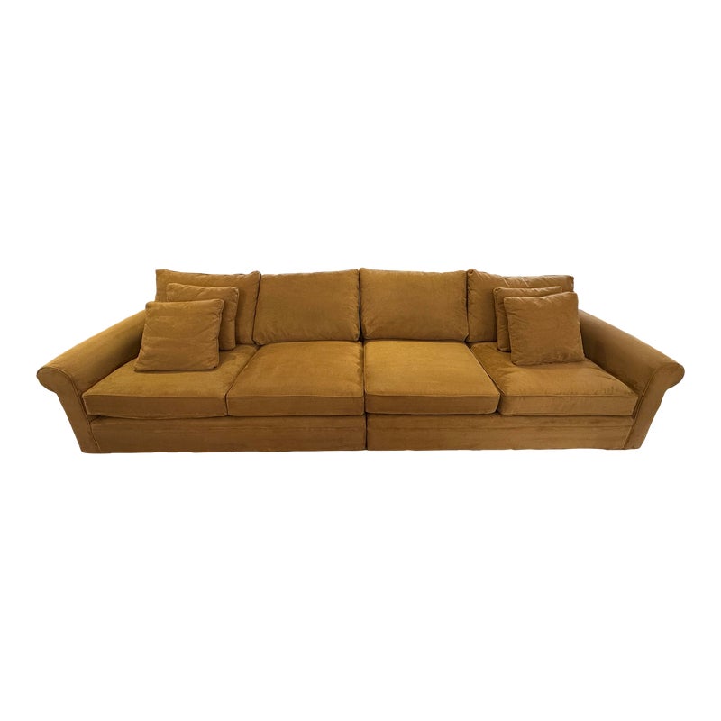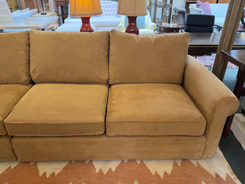 Design Plus Gallery presents a Two Piece Modern Concepts Doss Sofa by Macys. Lightly textured microfiber upholstery in a warm Dijon hue, the roll arm pair can be positioned together or apart for your ideal gathering space. Loose foam filled back and seat cushions. Light surface wear; a few spots on one cushion; condition is good for age and use.