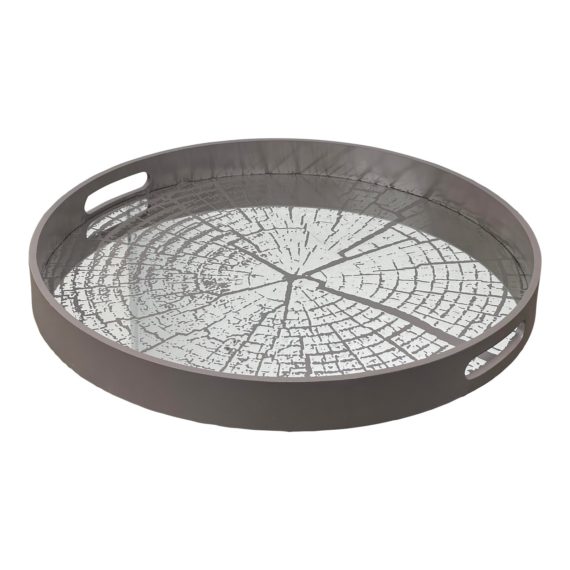 Design Plus Gallery presents the Fran XL Woodgrain Mirror Tray from Made Goods. A subtly unique round mirror tray features a reverse-painted white wood grain design inspired by cross-cuts of birch trees to add a touch of natural beauty to your decor. In good condition with minor evidence of wear.