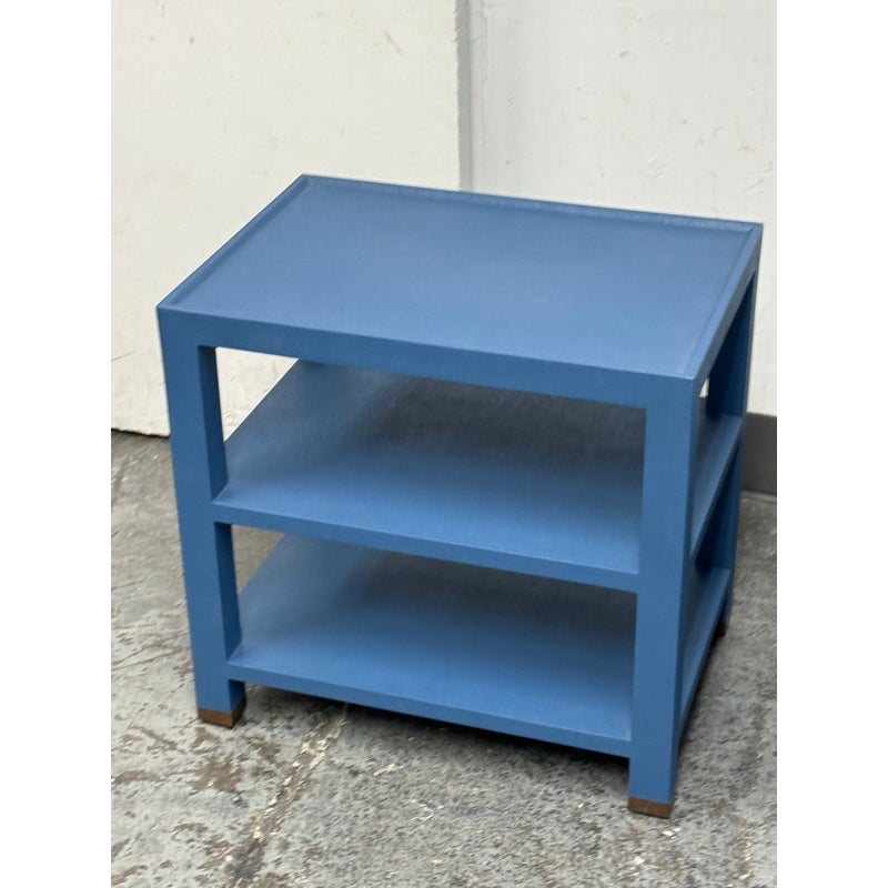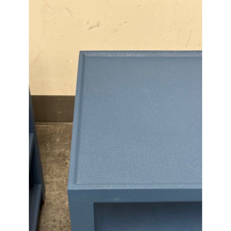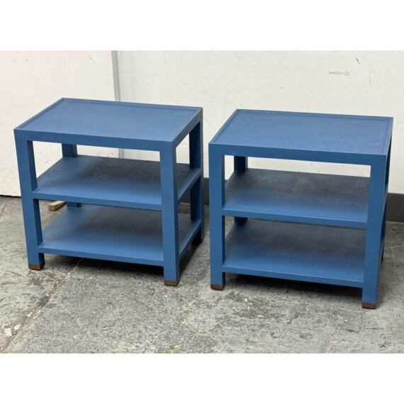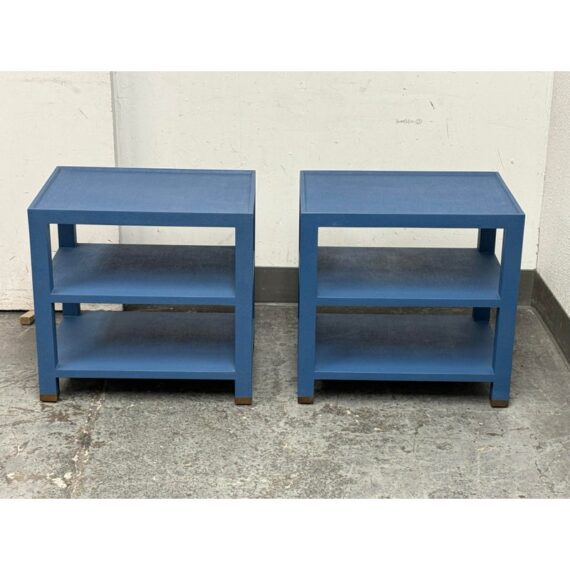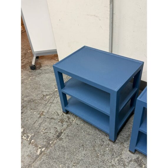 Design Plus Gallery presents a Pair of Jarin Side Tables from Made Goods. These useful bed side table are fully wrapped in blue Belgian linen and the textured surface brings out a subtle sheen. A raised lip frames the surface and provides a tailored edge to reinforces the table’s precise geometry. Two open shelves are perfect for displaying your keepsakes and there are metal-capped feet add a neat contrast at the base. These were showroom samples and they are in good condition with visible and minimal wear from usage.