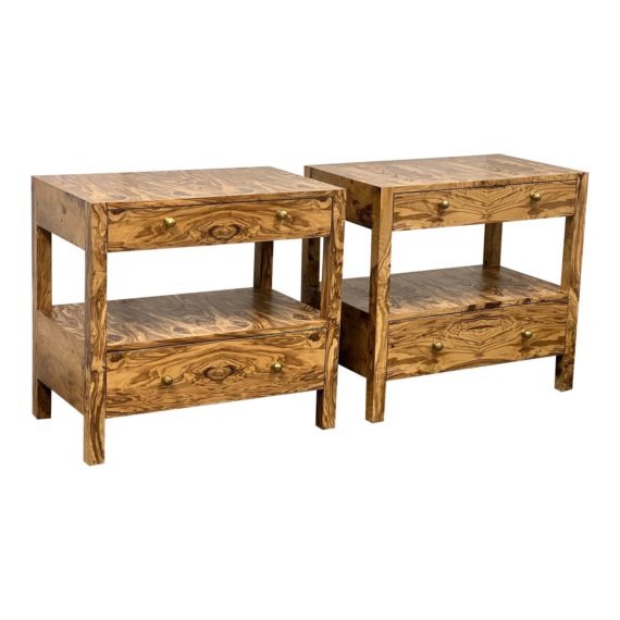 Design Plus Gallery presents a Pair of Lindsey Double Nightstand Olive Ash Veneer by Made Goods. A clean silhouette allowing the vibrant pattern of the burled wood to shine through. Features two drawers and a generously sized shelf for ample storage and display options. The hardware are faceted brass a polished look. Minor wear from usage. Made in Philippines.