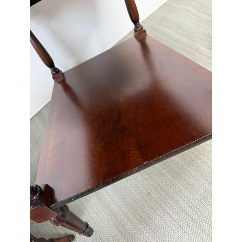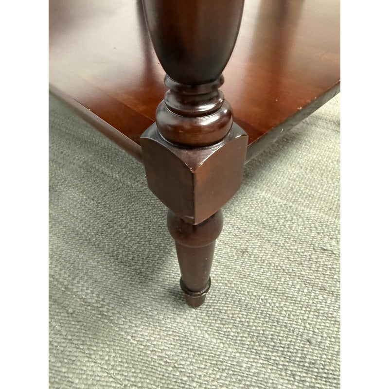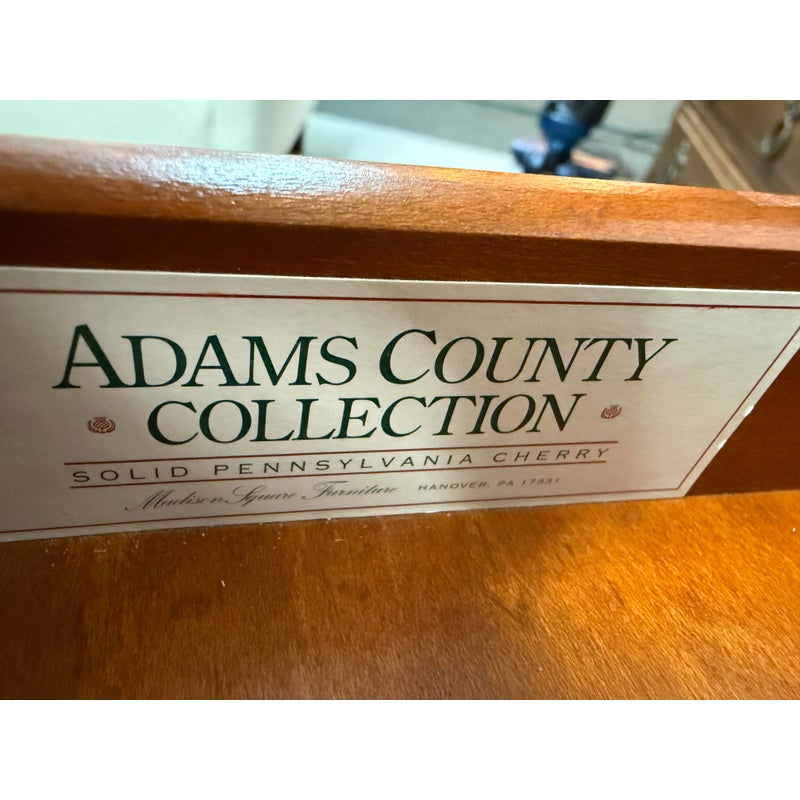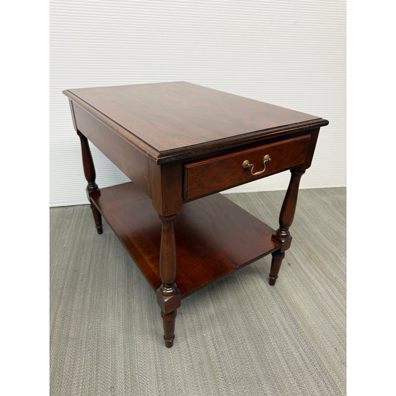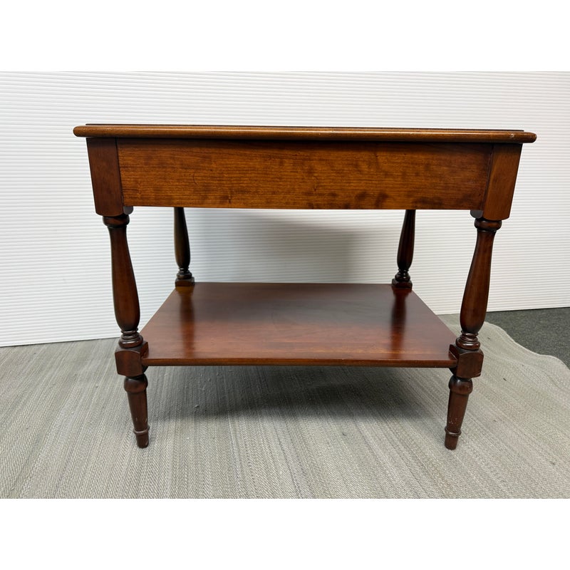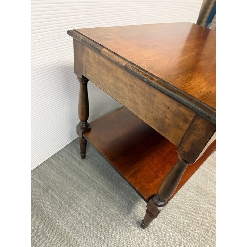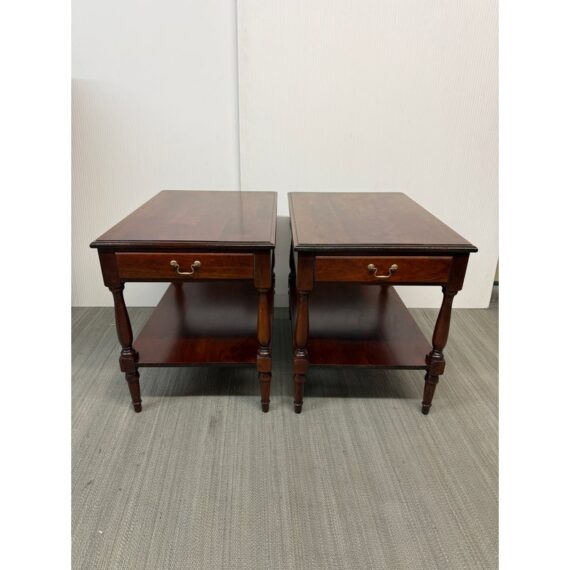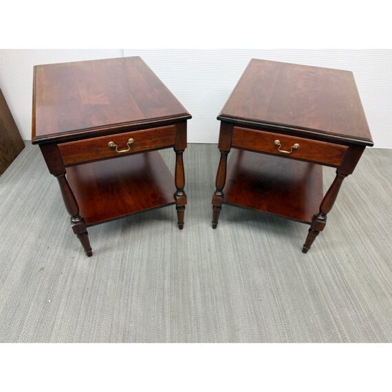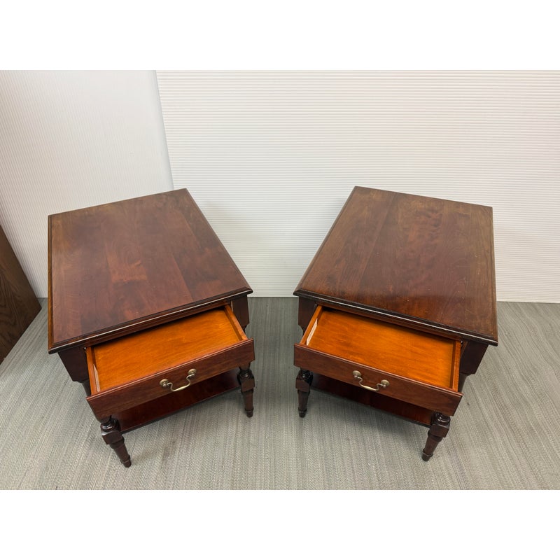Design Plus Gallery presents a Pair of Adams County Collection Side Tables from Madison Square. The Pennsylvania Cherry pair boasts classic details such as dovetail joinery, turned posts, and cast brass pulls. With expansive display and storage on both the top surface and bottom shelf, along with shallow drawer storage, these tables are ideal for placement near a sofa or bedside. Light surface wear; condition is good for age and use.
