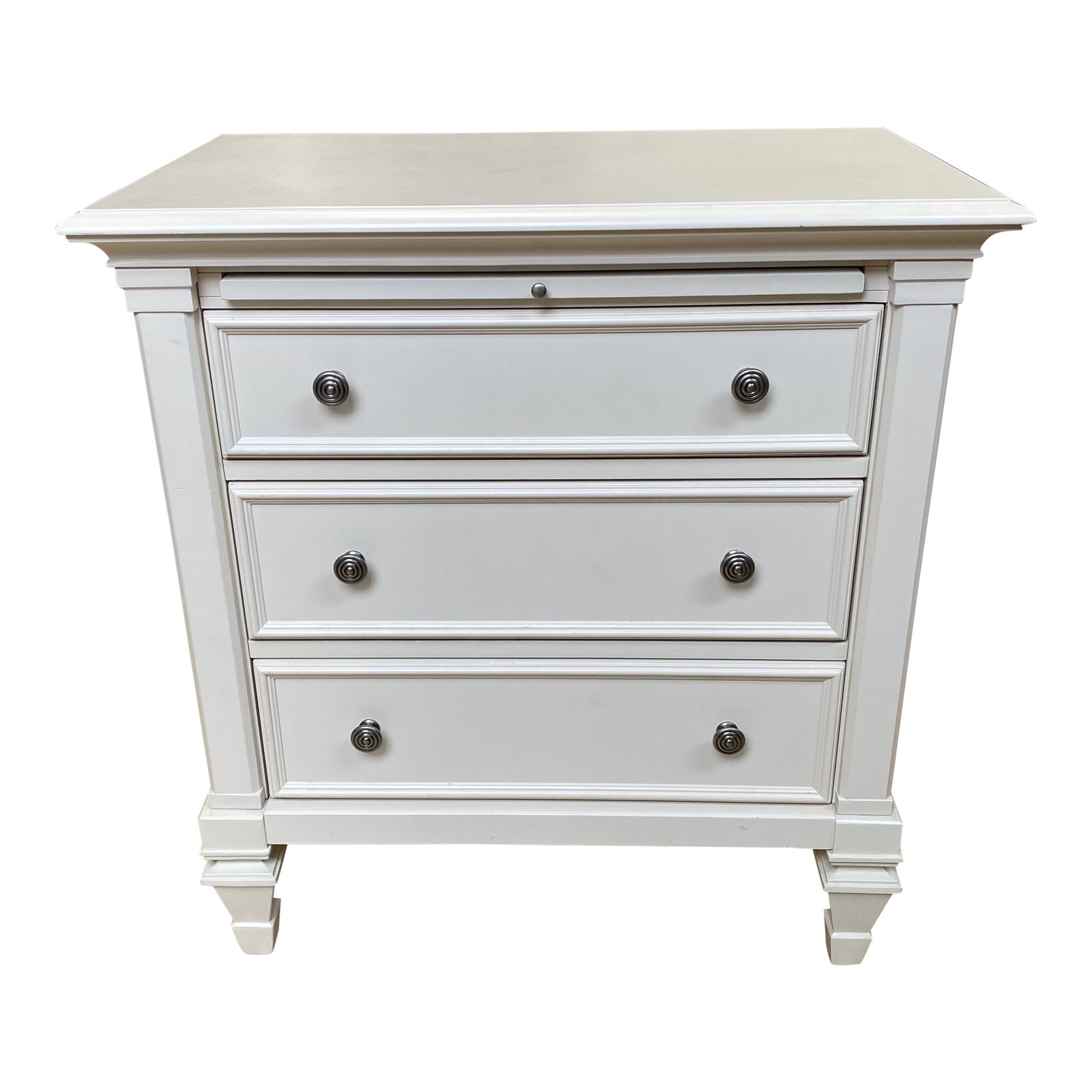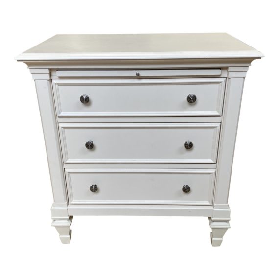Design Plus Gallery presents a Magnussen Home Alabaster Somerset Nightstand. Solid kiln dried frame is finished with a satin white coat of paint with rimba veneers on the neo-classical inspired moldings. Fired-nickel hardware contrasts the nightstand’s white wood finish for a beautiful finishing touch. French and English dovetailed drawers are all equal in size. On top of the bank of drawers there is a pull out tray as well. Minor wear, made in Vietnam.
