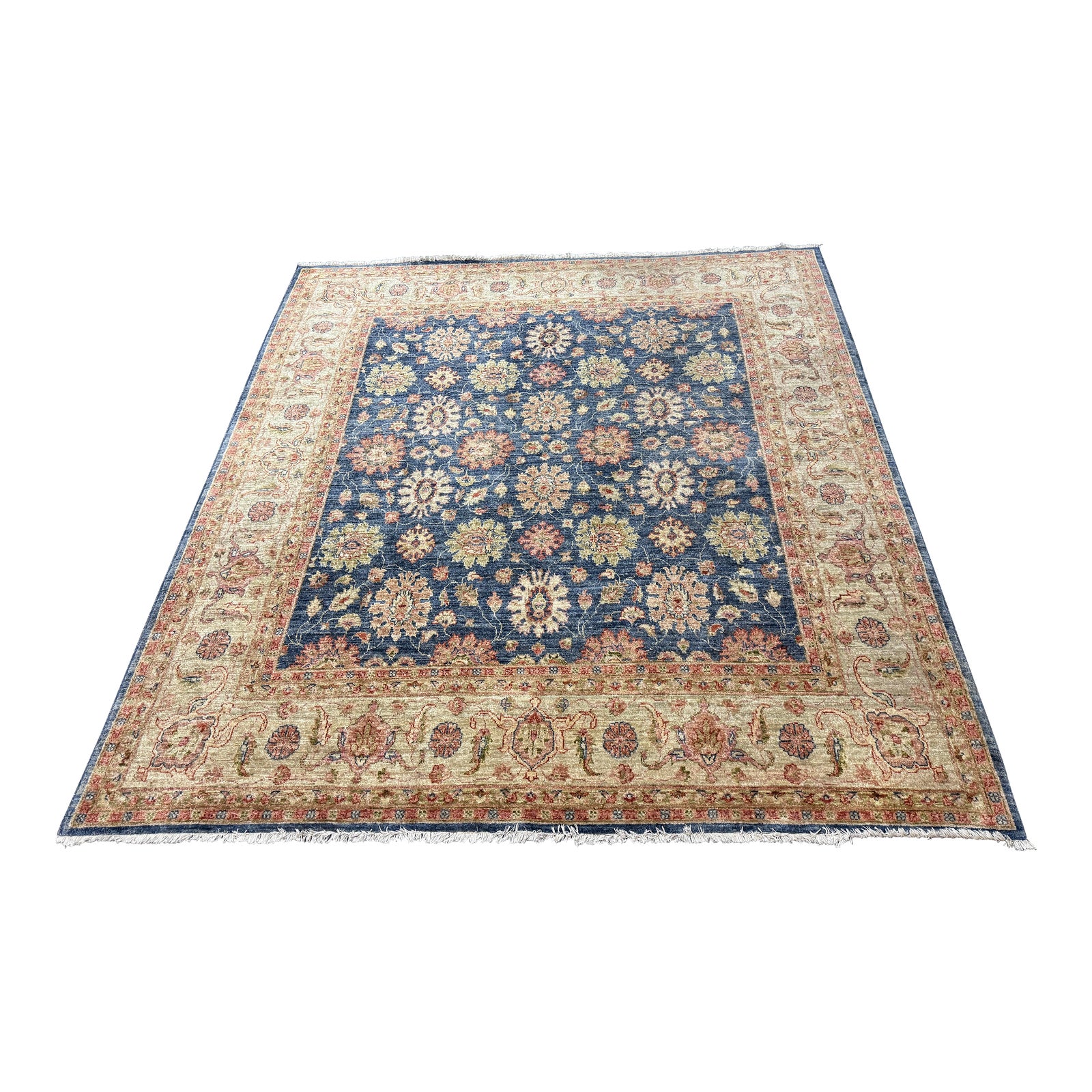 Design Plus Gallery presents a Persian Majhal Area Rug. An elegant color combination, in blues reds, tans, yellows, and oranges, this lovely rug is rendered in an allover Mina Khani pattern with a broad border. 100% hand knotted with short fringe. Light evidence of wear; overall good condition.