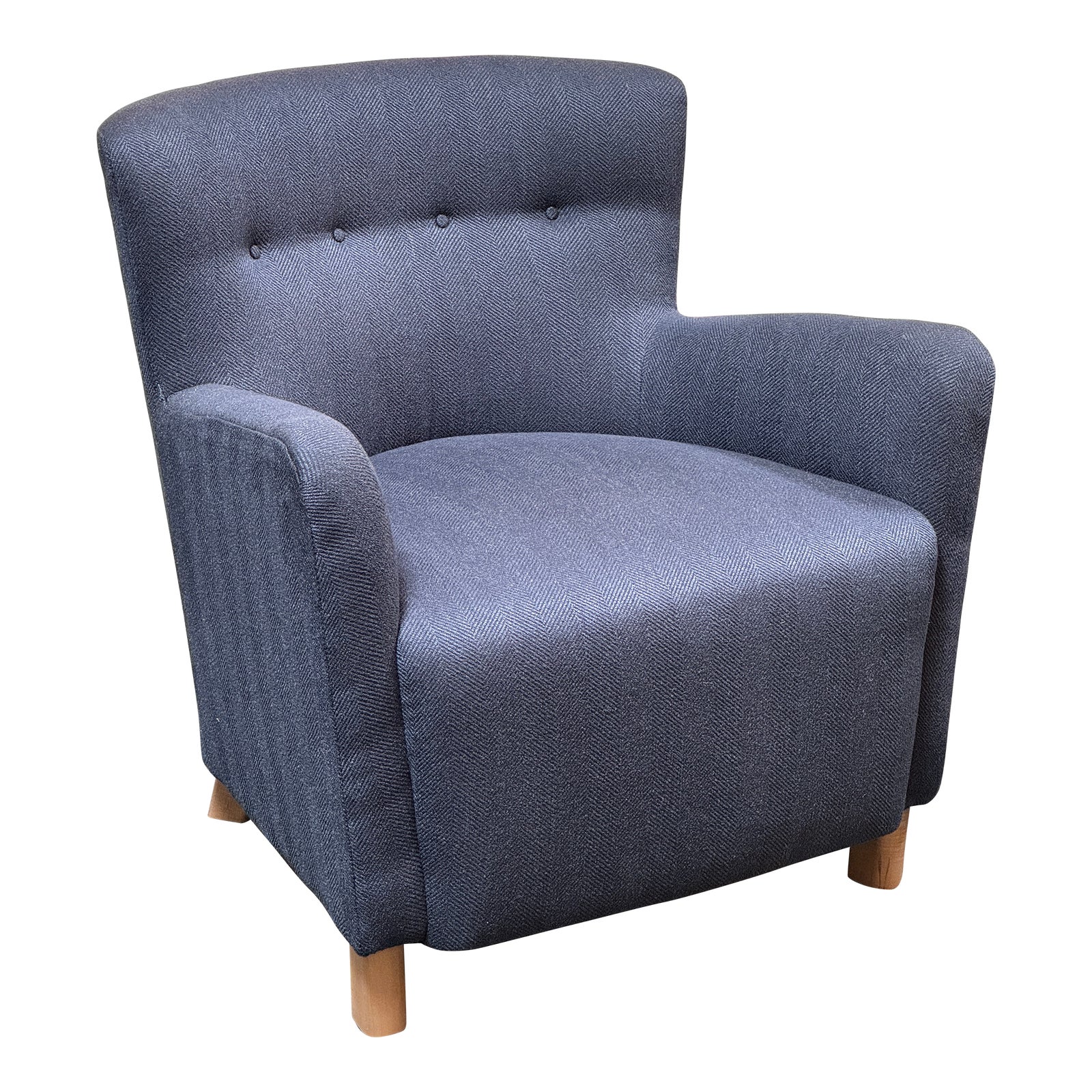Design Plus Gallery presents a Perry Club Chair by Maiden Home. Referencing midcentury design, this casual tufted chair marries craftsmanship, and comfort. The curved silhouette and proportion make it perfect in most spaces. Plush cushioning in the tight back and seat deliver beautifully tailored Indigo comfort. Crypton Textured Chevron performance upholstery. Light wear; condition is consistent with age and use.