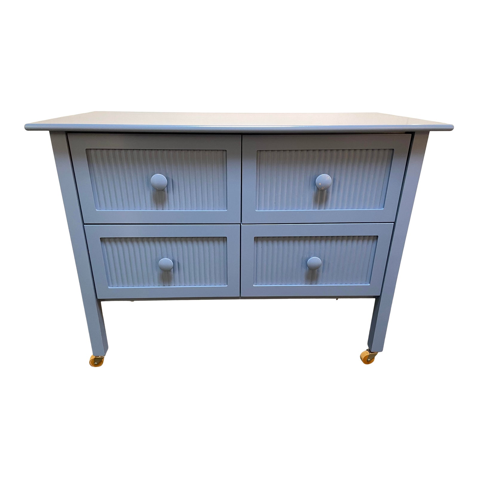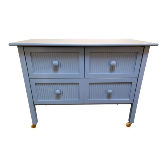 Design Plus Gallery presents a beautifully scaled dresser by Maine Cottage Furniture. A China-Blue painted dresser that is a core piece of storage furniture and serves as a good foundation to a clean coastal or cottage look. This colorful dresser has full-sized bottom drawers with exceptionally deep drawers for storage. Lovely ribbed panel drawer front detail, with turned knobs, bull nose top and tapered legs for a light look. Casters for ease of movement.