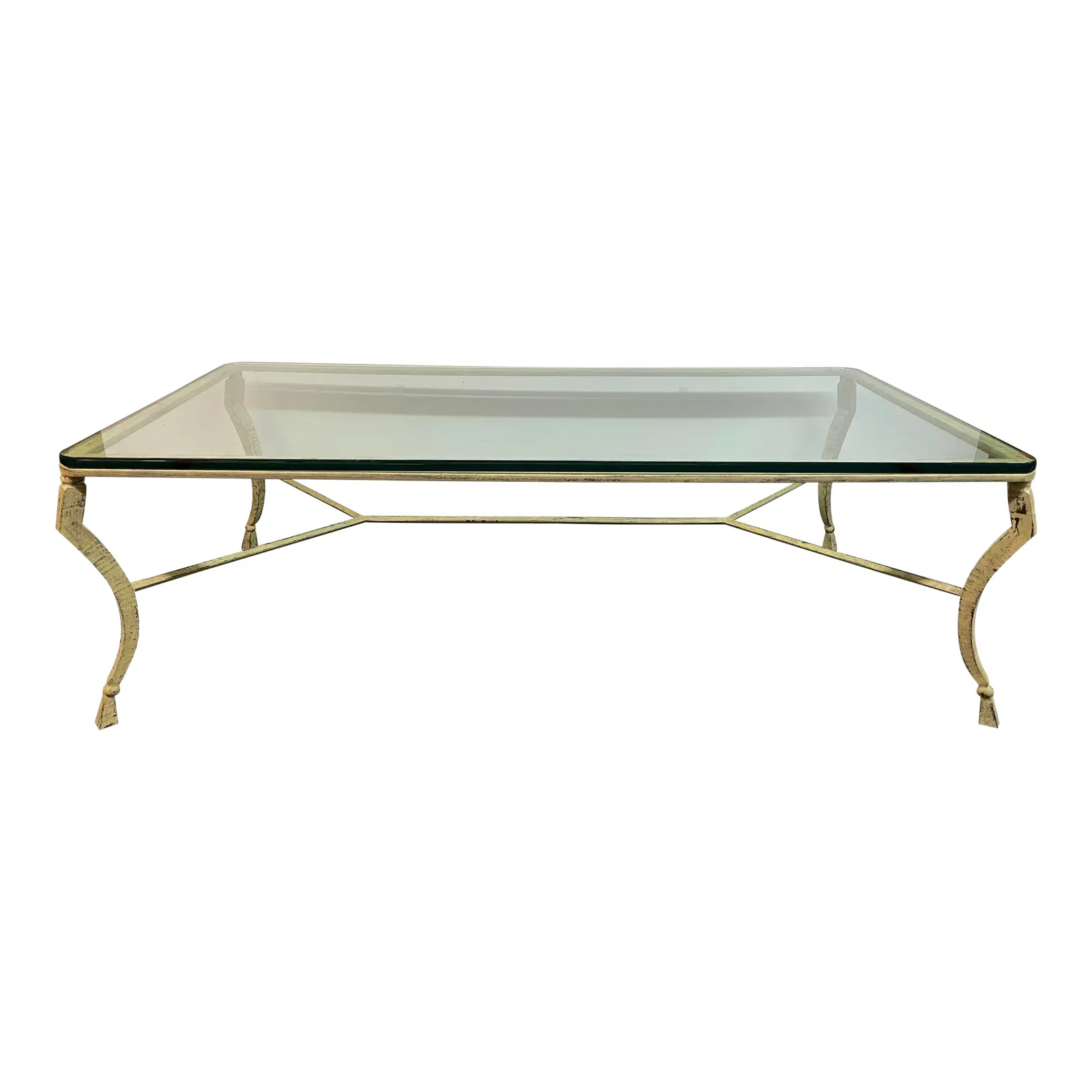 Design Plus Gallery presents a Custom Solid Iron + Glass Maison Jenson Style Coffee Table. Solid iron base has saber feet which curve elegantly inward and end in hoofed feet. Solid iron legs are further supported with a thin and elegant trestle formation. Iron is coated an evenly antiqued patina of cream and allows for the raw texture and tone of the iron to show through evenly through out. Thick glass is cut perfectly to fit the frame with polished sides and has a slight green tint. Visible wear. Table is custom made and heavy.