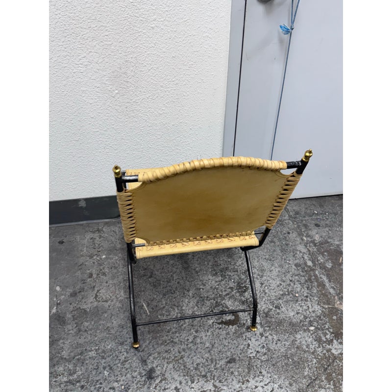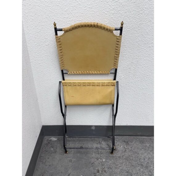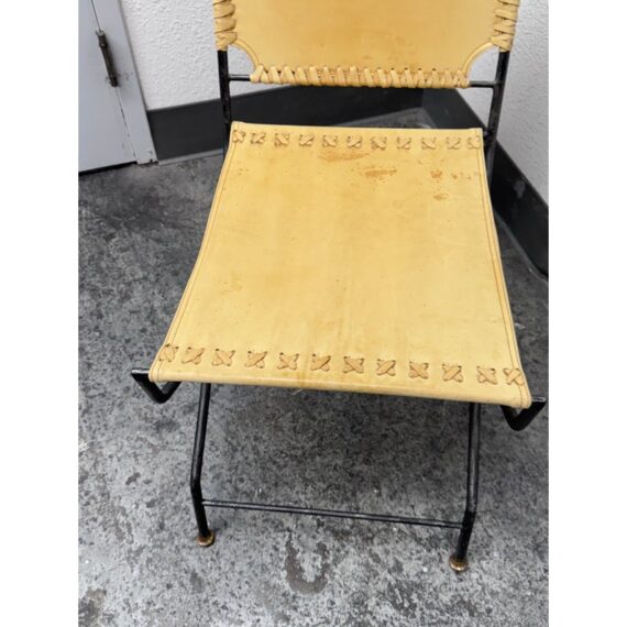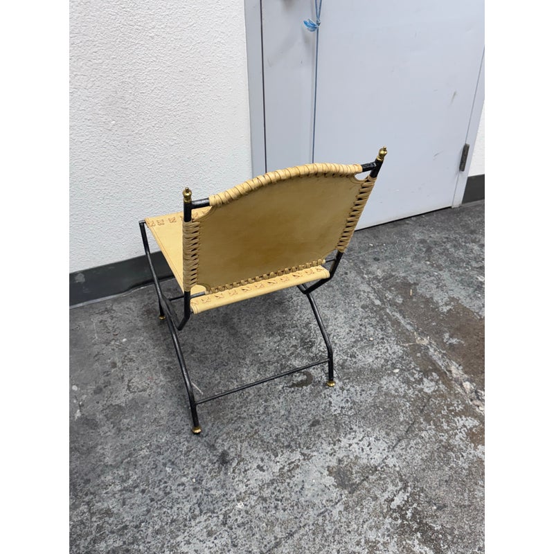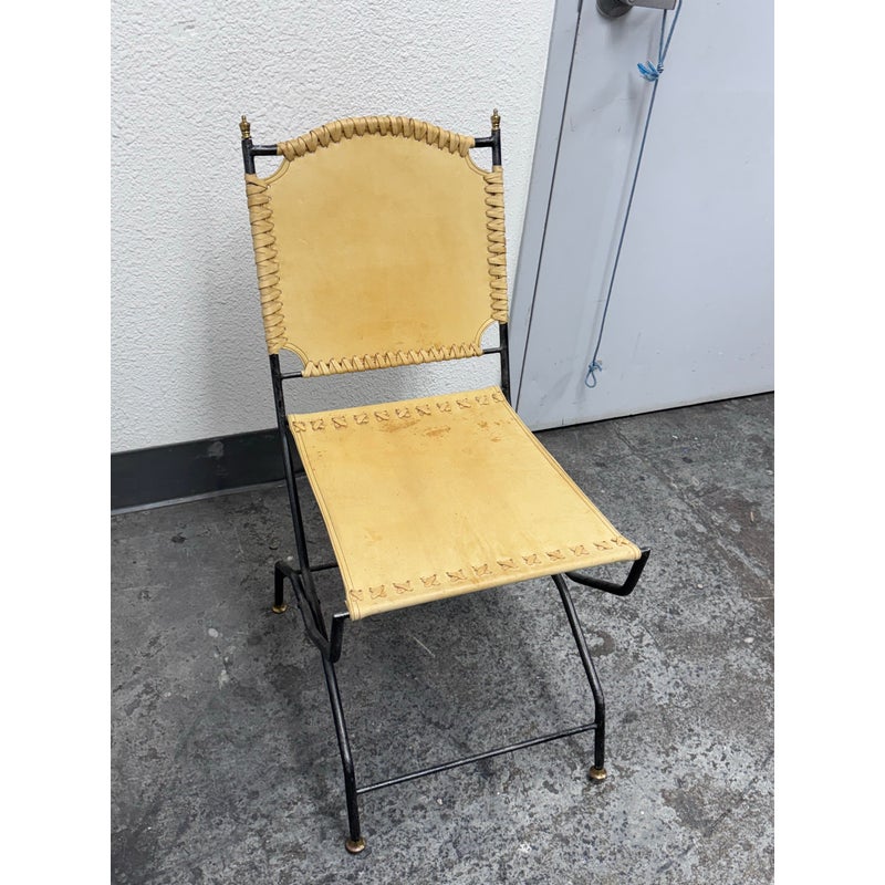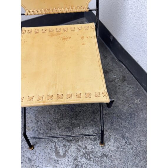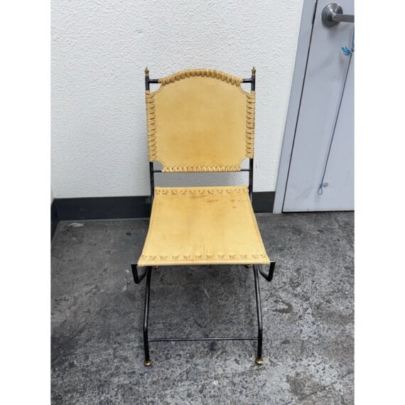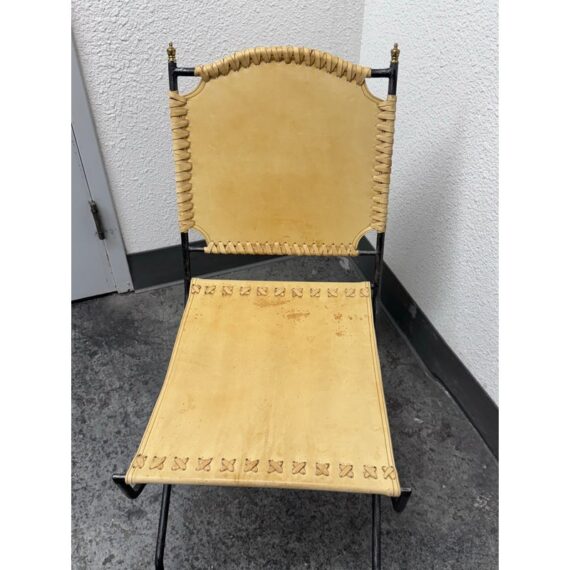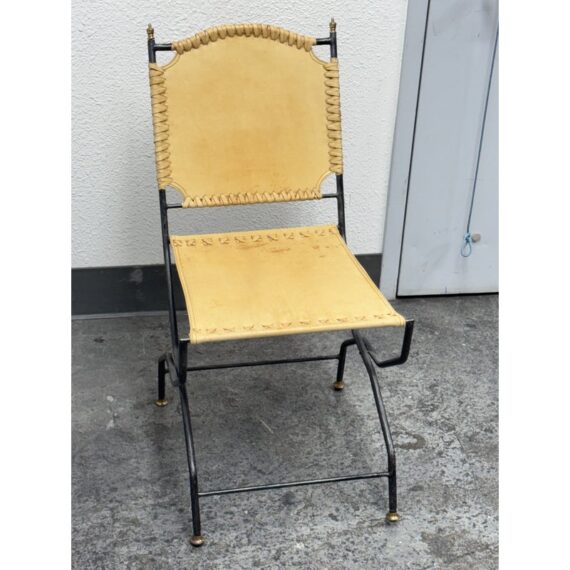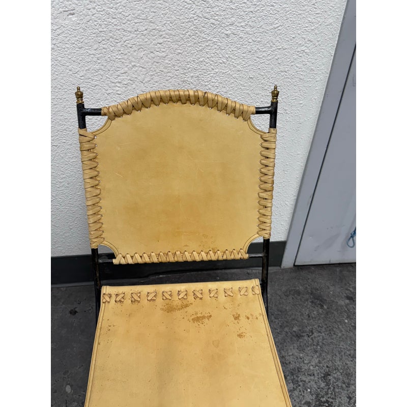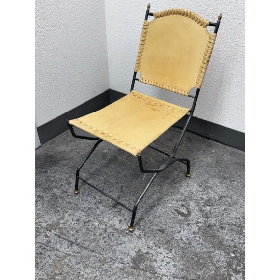 Design Plus Gallery presents an Iron + Leather Folding Campaign Chair from Maitland Smith. The chairs offer a sturdy iron frame with a seat and seat back of saddle like leather. The use of durable materials like iron and leather aligns with the practical and robust nature of campaign furniture. The “folding” aspect indicates a practical design that allows for easy storage in your home and transportation. The visible stitching on the leather back adds a decorative and handcrafted detail typical of Maitland Smith’s attention to artistry. In good condition, visible and minimal wear from usage.