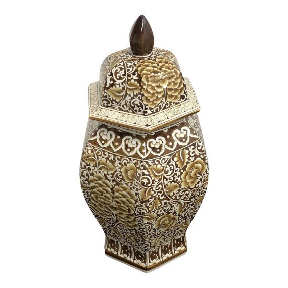 Design Plus Gallery presents a Maitland Smith Ginger jar shaped urn with a lid. This beautiful piece was hand painted in Thailand.