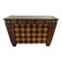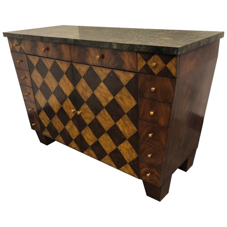 Design Plus Gallery presents a Maitland Smith Herringbone Parquetry Tessellated Sideboard. The hardware is a metallic gold finish. Fourteen pullout drawers for storage with two swing open doors. A single adjustable shelf on the inside. Beautiful decorate mosaic stone top. Great addition for the entry, dining room or office.