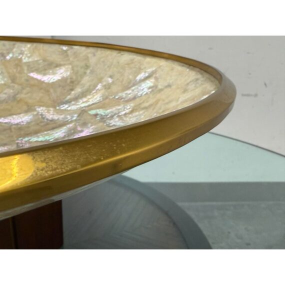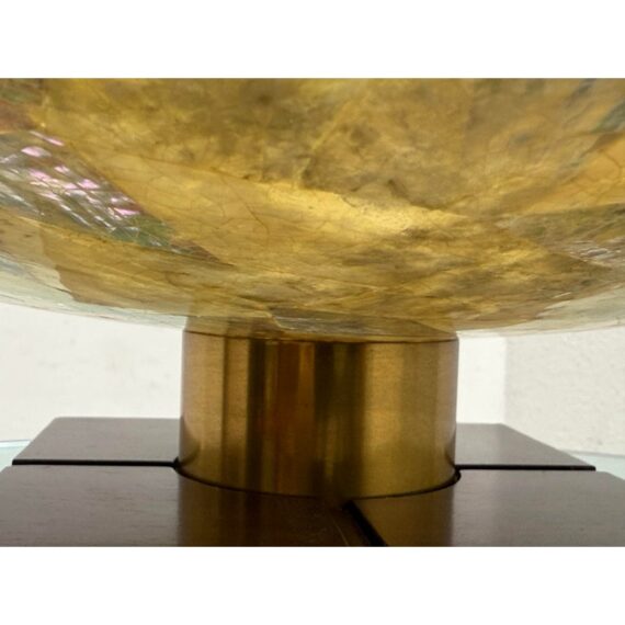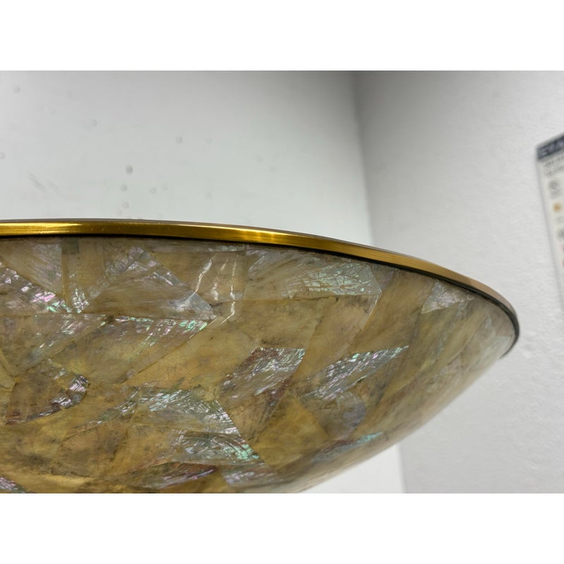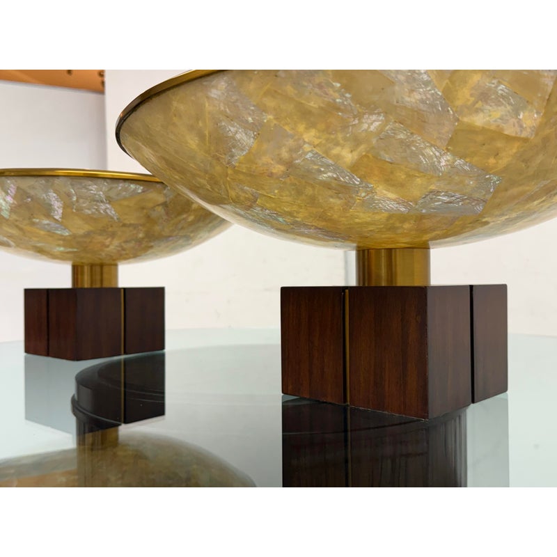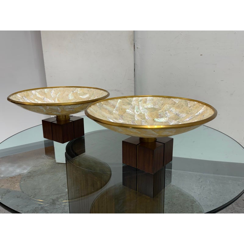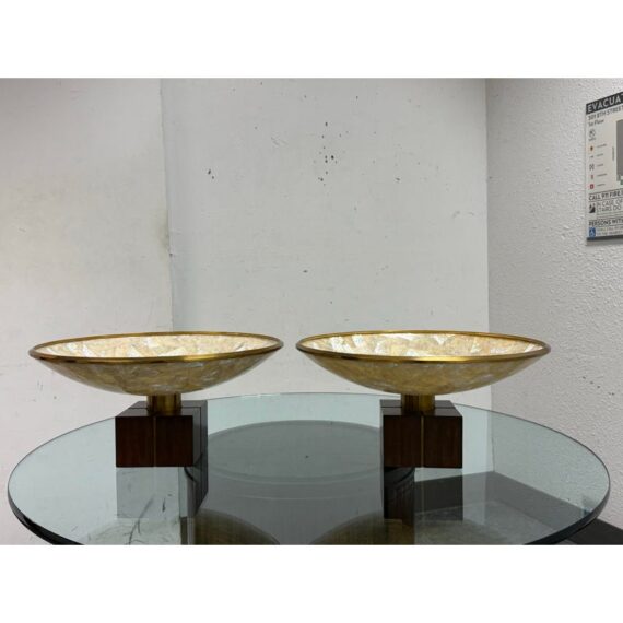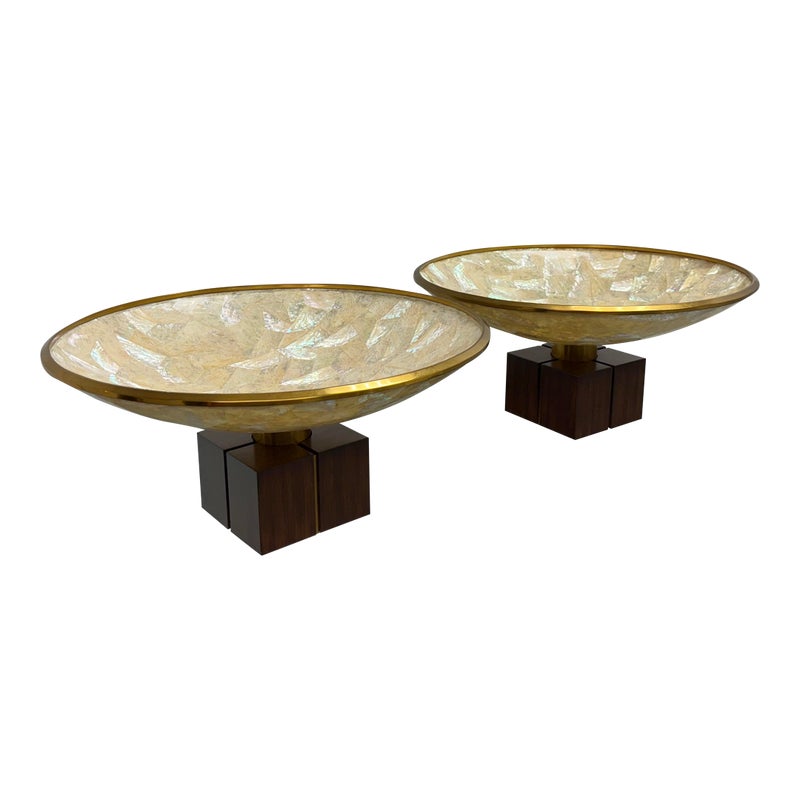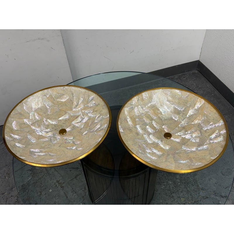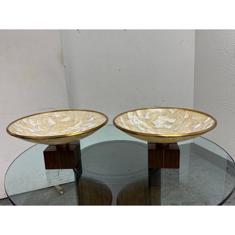 Design Plus Gallery presents a Pair of Mother of Pearl Decorative Bowls from Maitland-Smith. The set is just extraordinary as a fabulous creation of mother of pearl shaped into a rimmed dome with bronze around the lip and in their center stems. The stem affixes the bowl to the square base, that also has brass segments in the center of each side. Both are in good condition with minimal sings of surface wear for their usage.