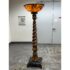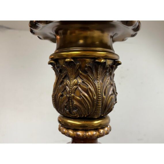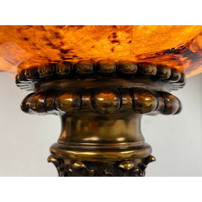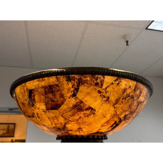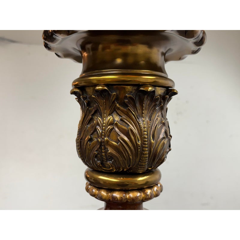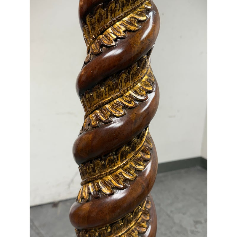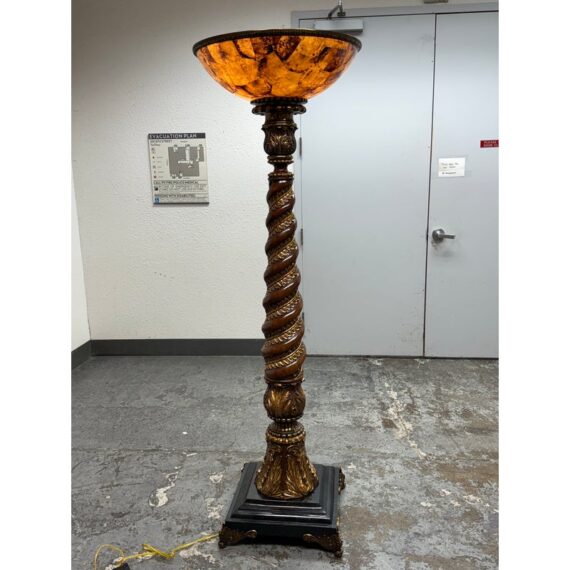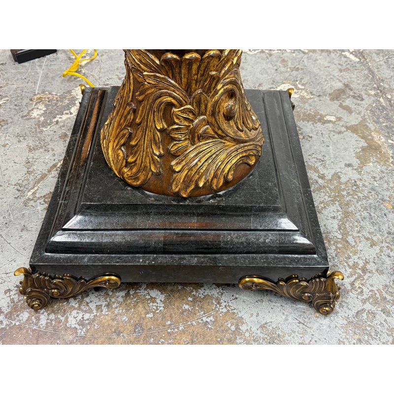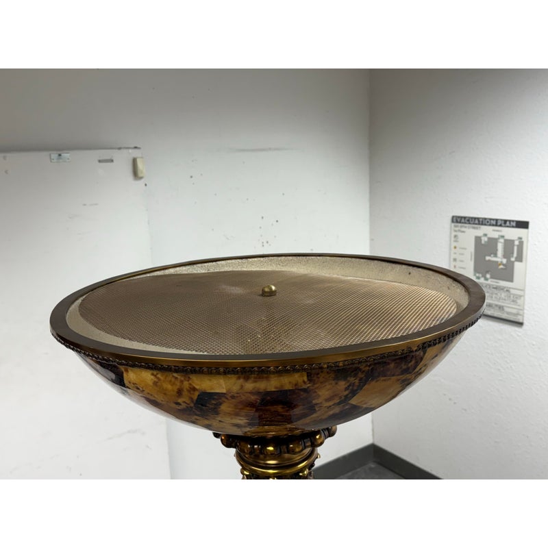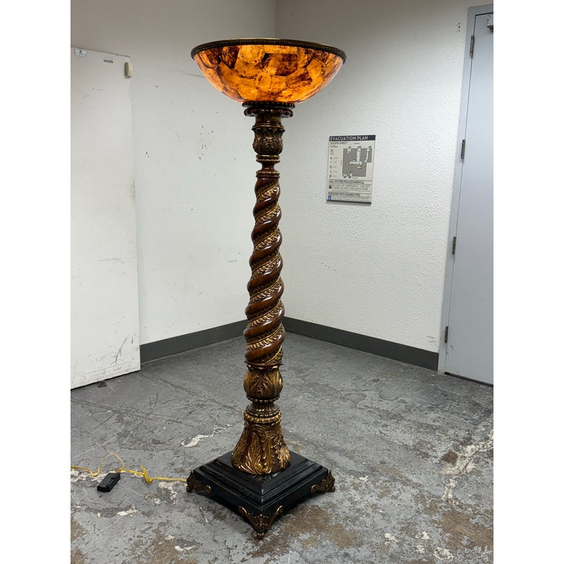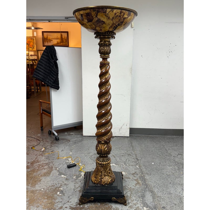 Design Plus Gallery presents the Torchiere Two Light Floor Lamp from Maitland-Smith. The lamp has a faux tiled shade, foliate gilt metal capital over twisted standard. It rises on a stone base that ends with whorl feet. Overall the floor lamp is in good condition with minimal wear for its usage. Made in the Philippines.