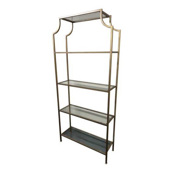 Design Plus Gallery presents a Pagoda Style Etagere by Maker & Moss. The classic silhouette in antiqued brass finish is simplified for an updated look. Each of five (removable) glass shelves have a mini bevel. Little evidence of wear; good overall condition.