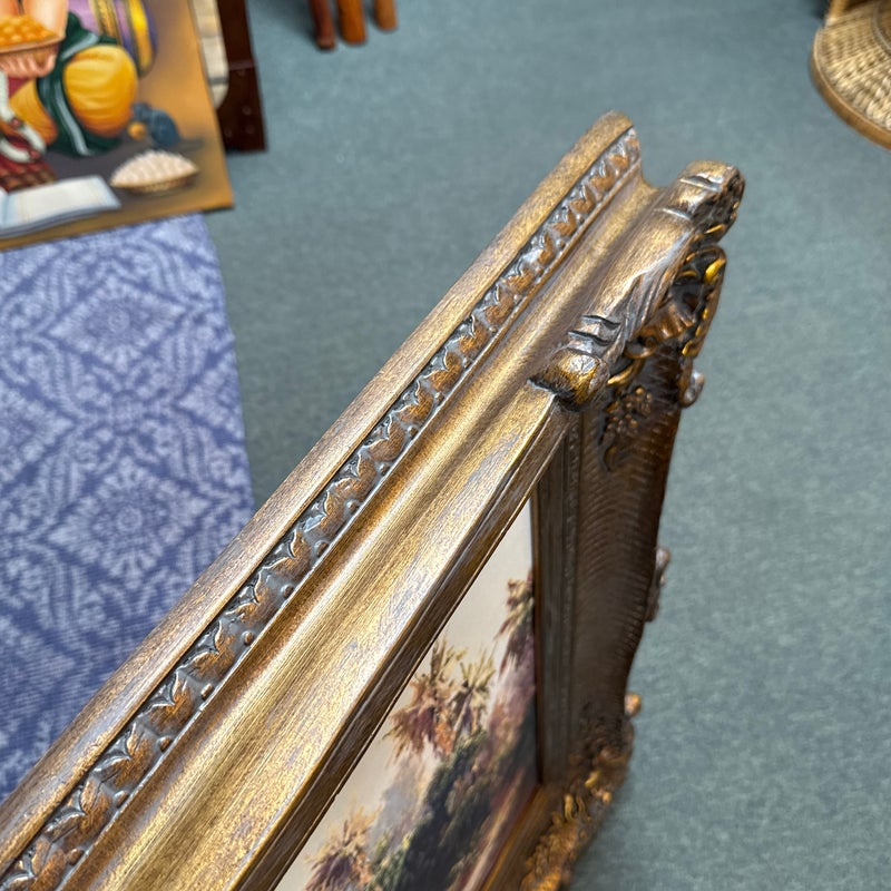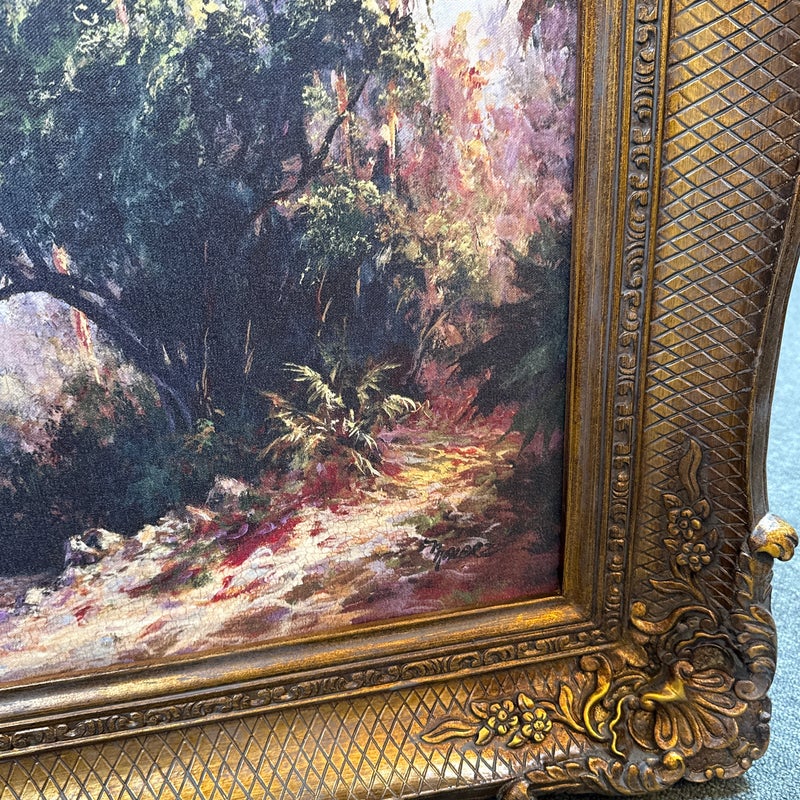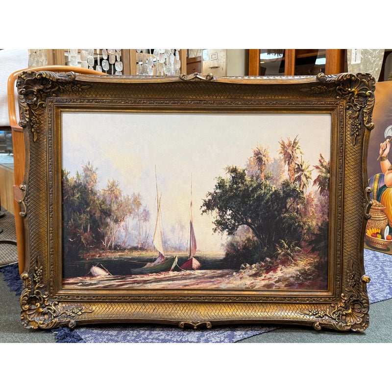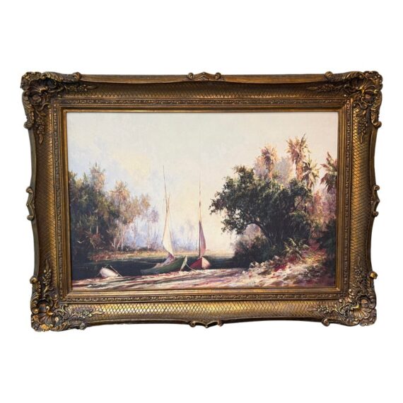 Design Plus Gallery presents “Peace River Sunset” a Reproduction Print by Malarz. The artist is well known for his landscape paintings of the beaches with beautiful palm trees. Noticed at a very early age, he was encouraged to pursue art as a career and knew that he would become an artist. The large work by this artist shows dramatic use of bold brush strokes of thick paint which contributes to the play of light and shadow on the surface and adds texture. Large ornate frame is a wonderful foil to the breezy seascape. Little wear; condition is good.
