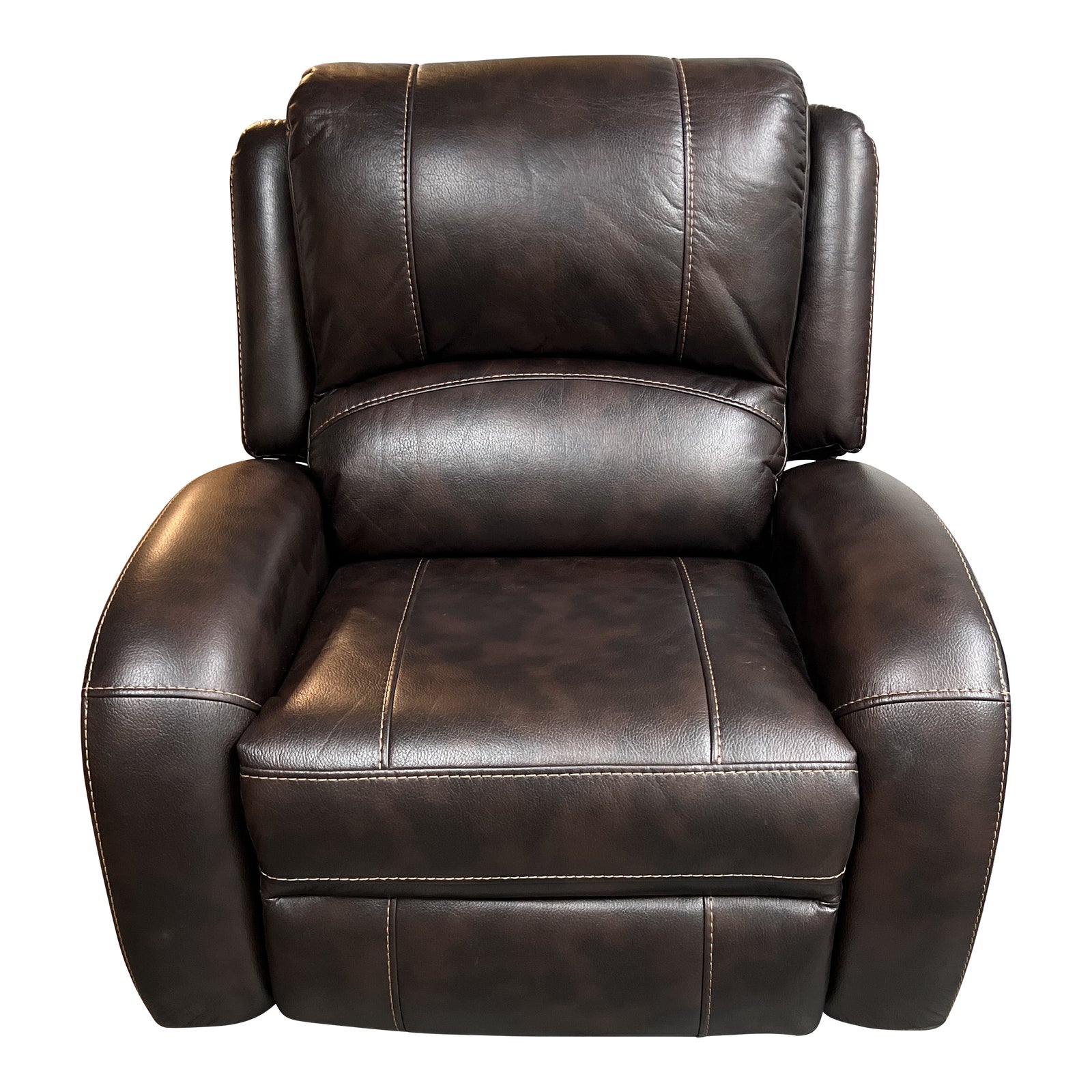 Design Plus Gallery presents a Leather Recliner by Man Wah Furniture. The chair is upholstered with brown leather. It has a recline mechanism that activates with a button on the right side. The symmetrical seams serve as as a functional accent. The cushioning is polyester fiber batting and a polyurethane foam pad. Minor wear from use; recliner is in good condition.