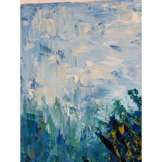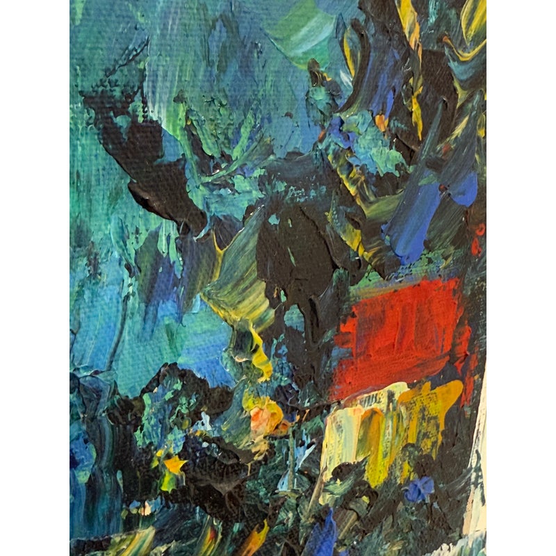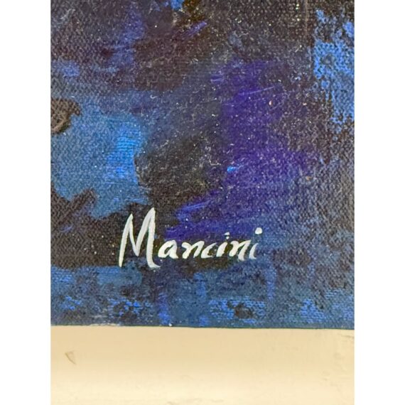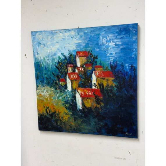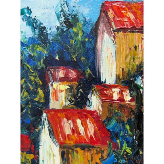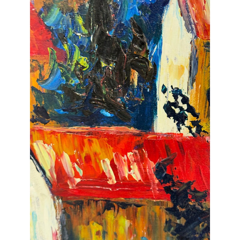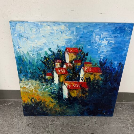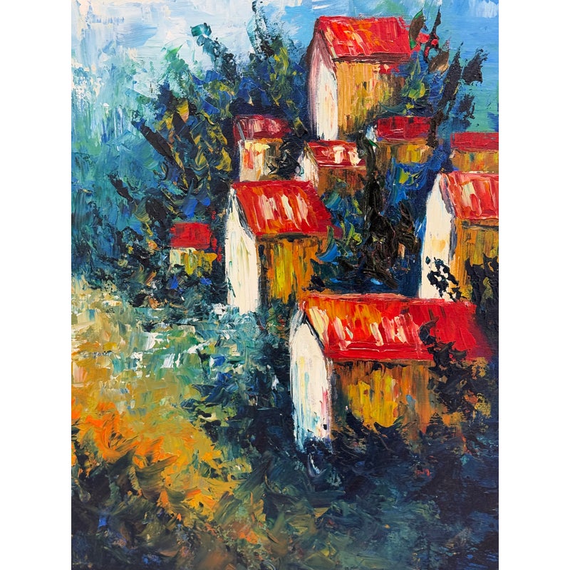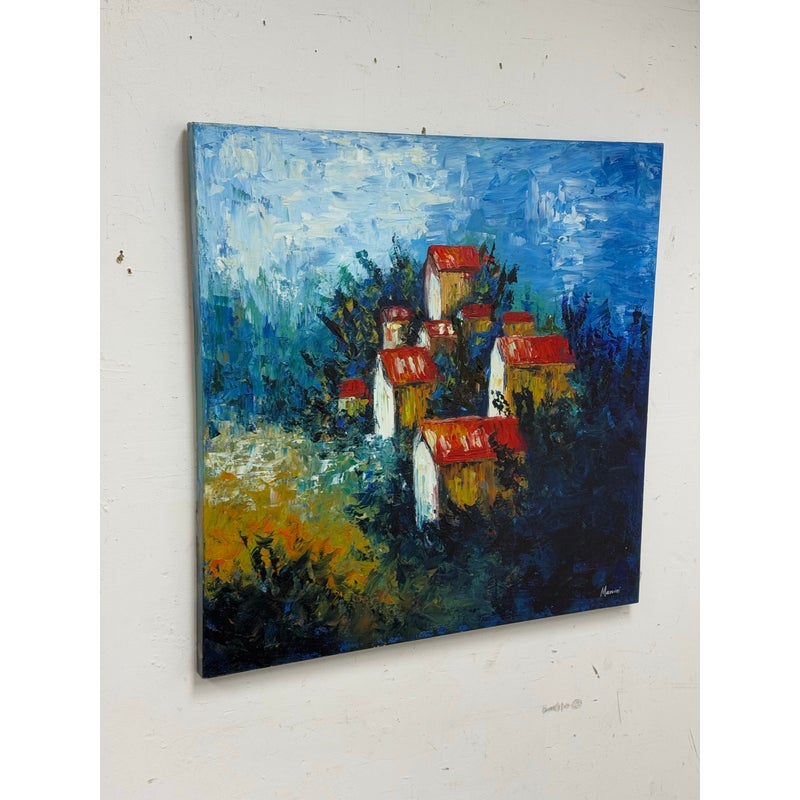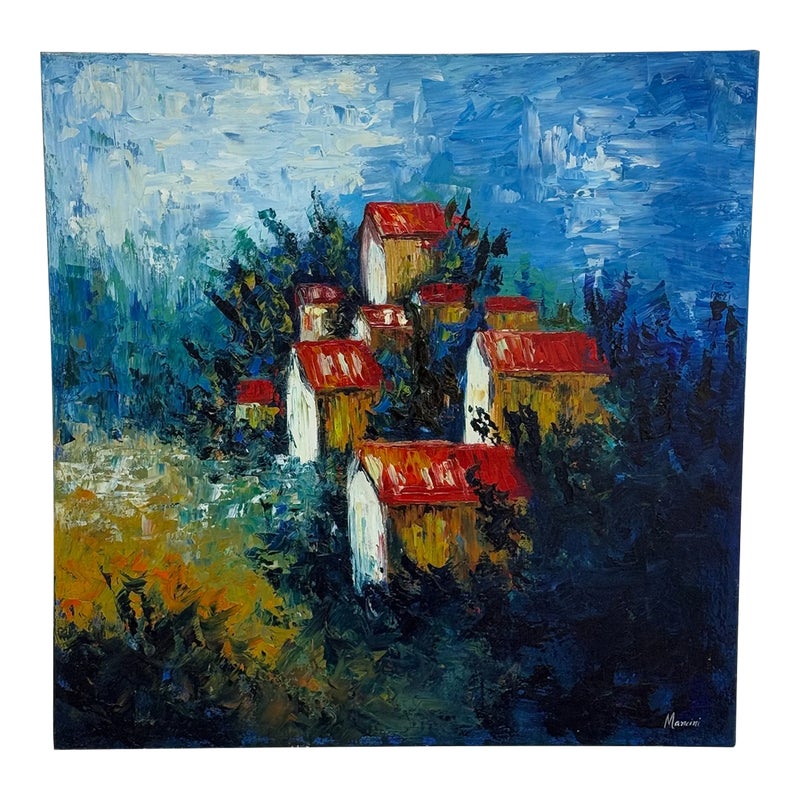 Design Plus Gallery presents a Palette Knife Art Piece of the Tuscan Hillside by Artist Signed Mancini. The painting is in bright primary colors of blue, red and yellow done in palette knife. The texture jumps off the work and colors are becoming. The painting is in good condition for its usage.