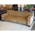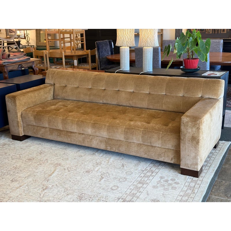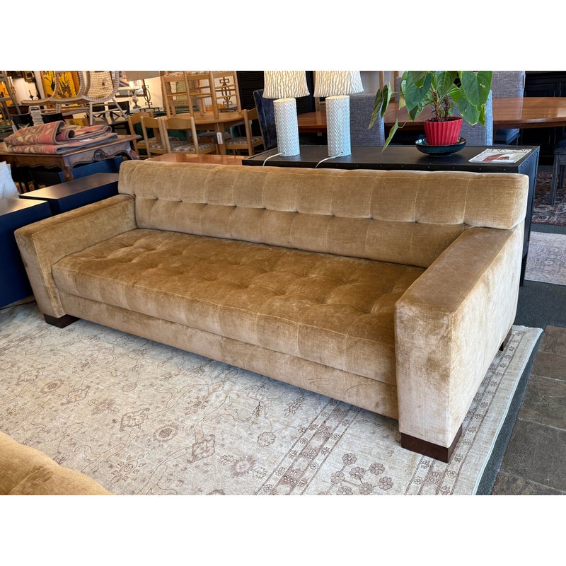 Design Plus Gallery presents a Pair of Fleetwood Sofas from Marbello Design. These are a custom pieces that were made to order with premium materials and superb attention to detail. Each sofa is enwrapped in a velvet mohair upholstery with the name of Lion from Rogers & Goffigon. The seat and back are exquisitely button tufted, similar to a Chesterfield with a higher back rest. There are wide track arms that are sturdy enough to take shape as additional seating when entertaining. The sofas are lifted off the ground with block feet in a dark walnut stain. Both sofas are in good overall condition with minimal signs of visible wear for its usage, with one having a significant stain to the fixed seat cushion.