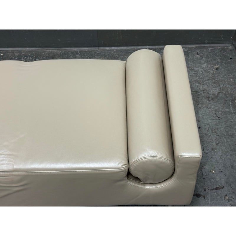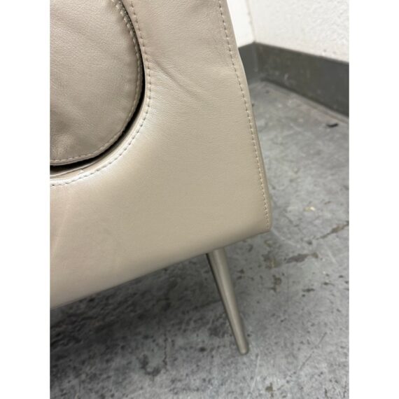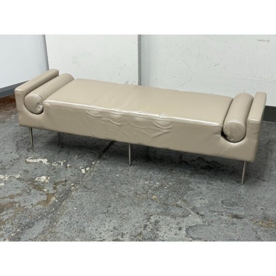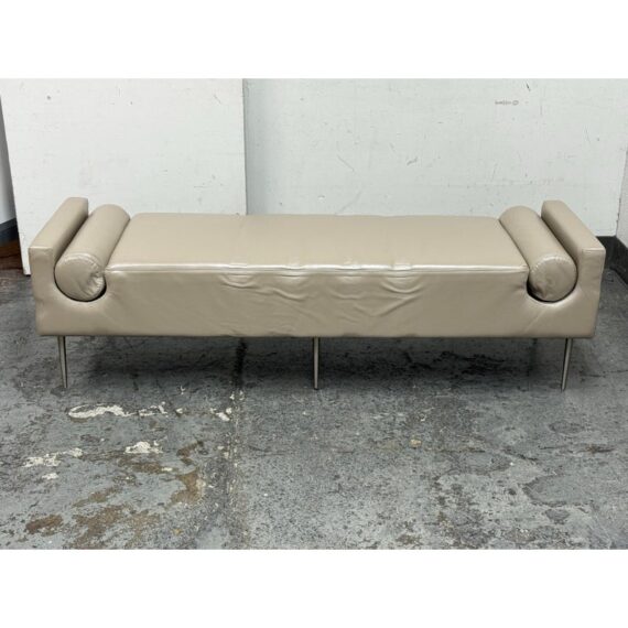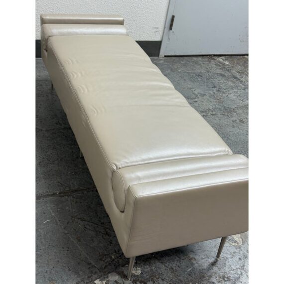 Design Plus Gallery presents the Miranda Bench Seat from Marcali Designs, Inc. The bench is striking and well made from a customizing company in the Los Angeles district of California. The bench is completely wrapped in a high quality taupe leather with two lumbar pillows that are positioned at either end with a their placement formed into the seat. It stands on four thin + tapered silver metal legs. Overall the bench is in good condition with visible indents on the leather and cushion insert and minimal signs for its usage.