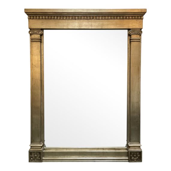 Design Plus Gallery presents the Corinthian Wall Mirror by Marge Carson. Classical beauty and style, the platinum leafing defines intricately carved egg and dart, framed rosettes and ionic capitols on the frame. Produced in 2000, a timeless reflection of your excellent taste.