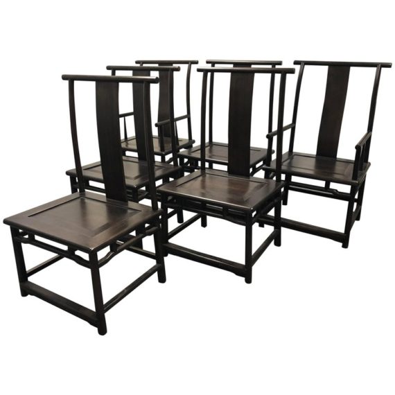 Design Plus Gallery presents a set of six Asian Style Dining Chairs designed by Maria Yee. As a designer she captures the graceful elements of classical Chinese design. The set includes two arm chairs and four sides. The chairs can work around many different style of dining tables. The possibilities are endless. The set has a deep rich Walnut finish.