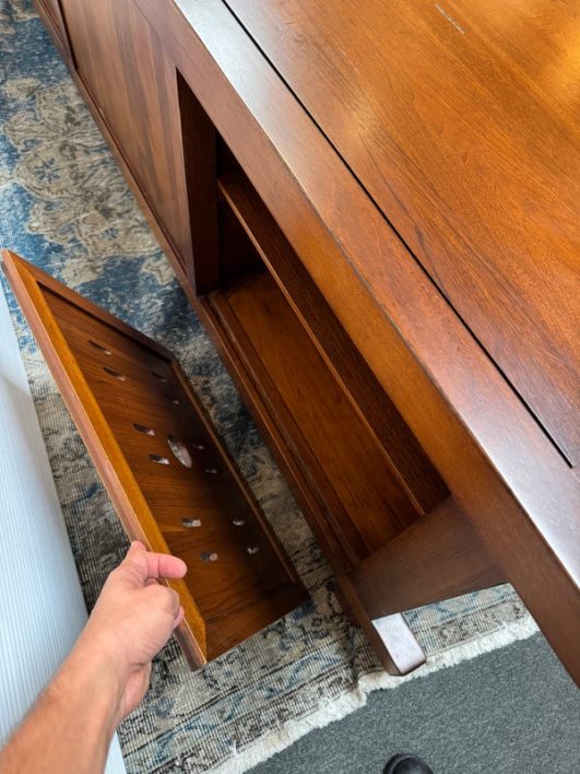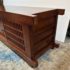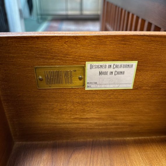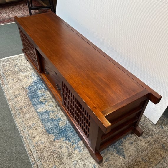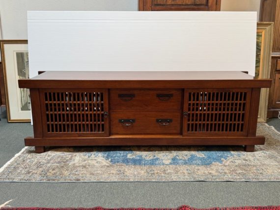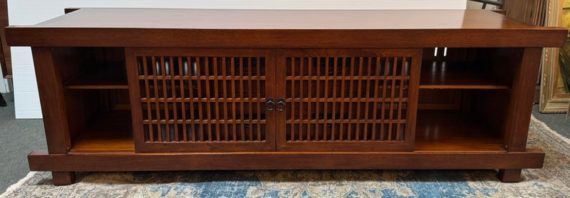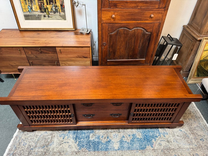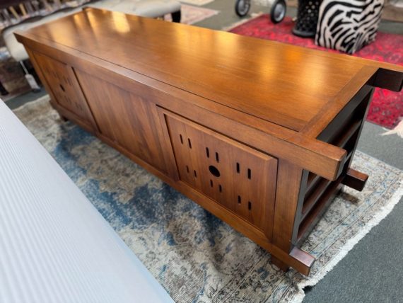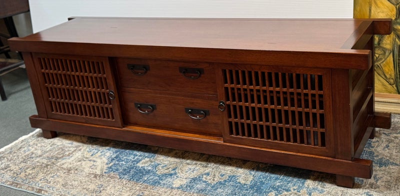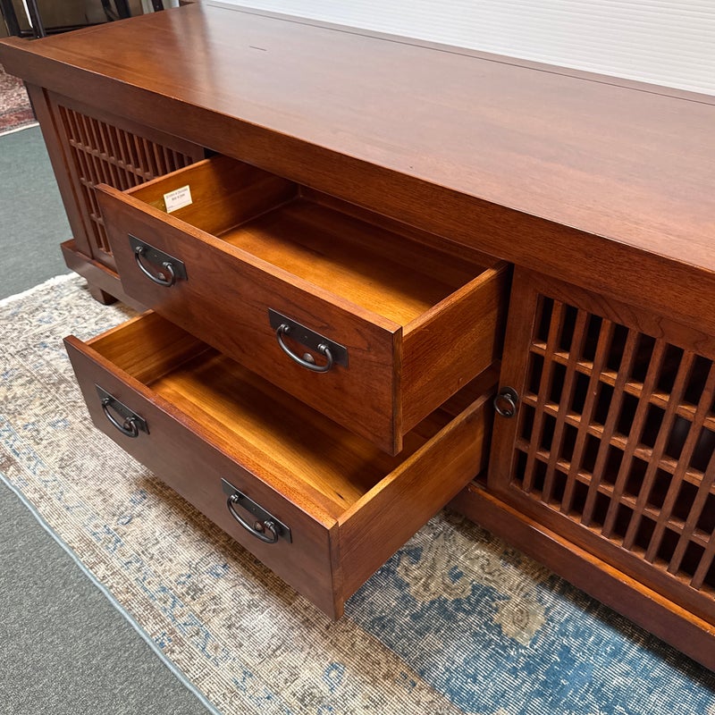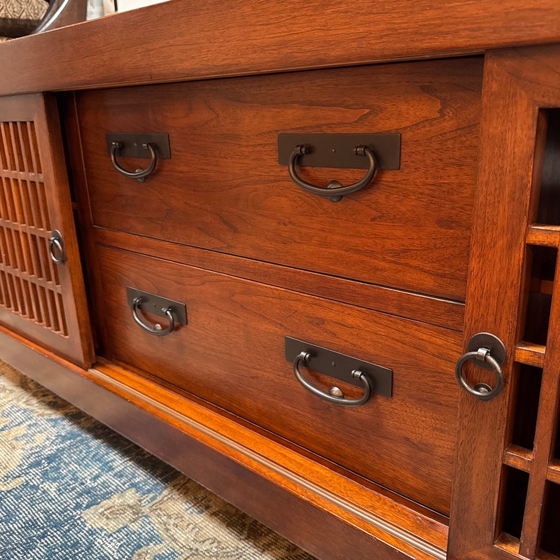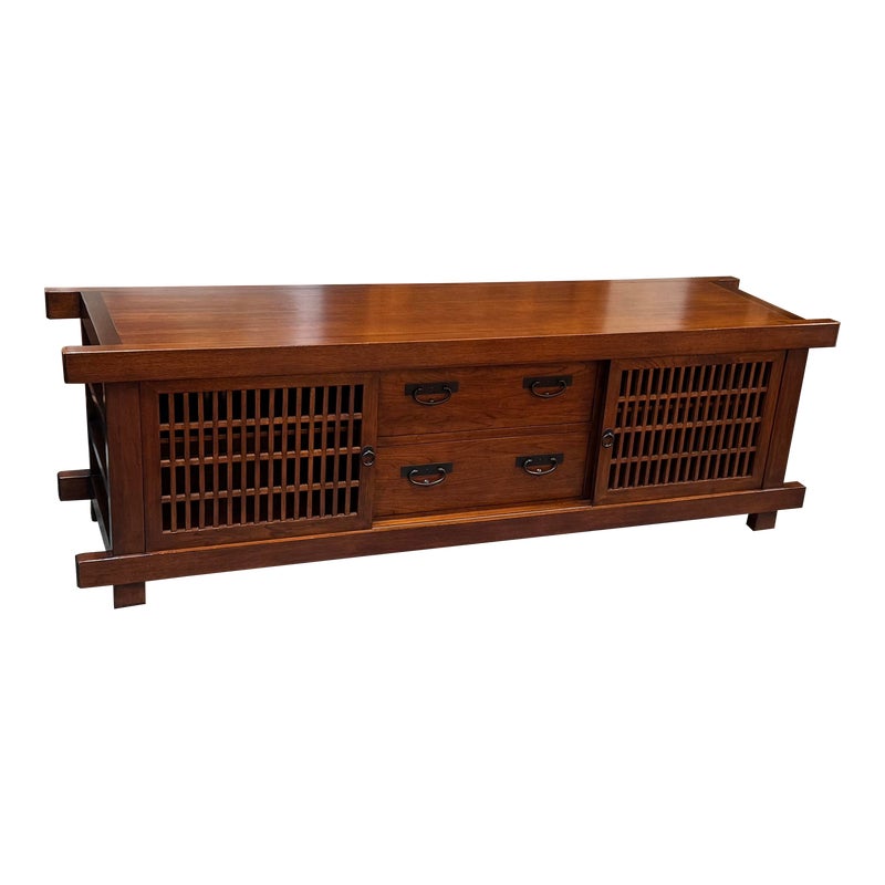 Design Plus Gallery presents the Shinto Credenza by Maria Yee. Inspired by traditional Japanese shrines, clean lined silhouette transforms your space into a serene retreat. Traditional lattice work and attention to detail is handcrafted using joinery techniques, honed through the ages without nails or screws. Crafted from responsibly harvested solid hardwood, patented BambooTimbre™. Sliding doors hide or reveal two drawers and removable shelves. Iron hardware. Light evidence of wear; good condition for age and use. Designed in California, made in China.