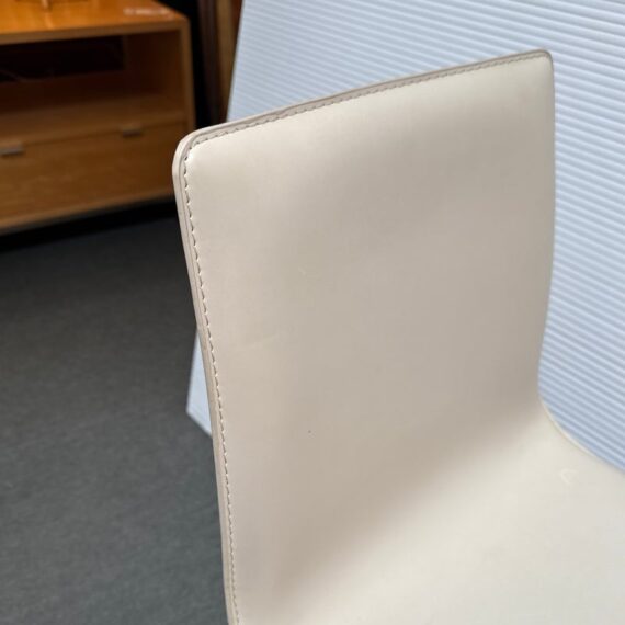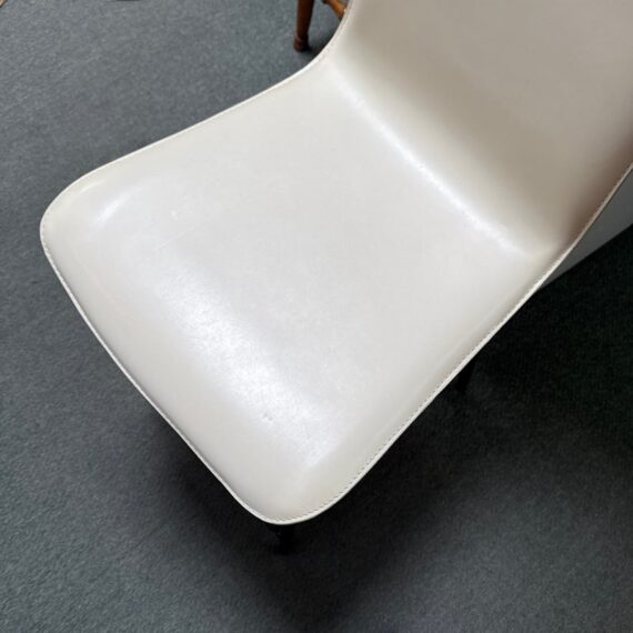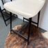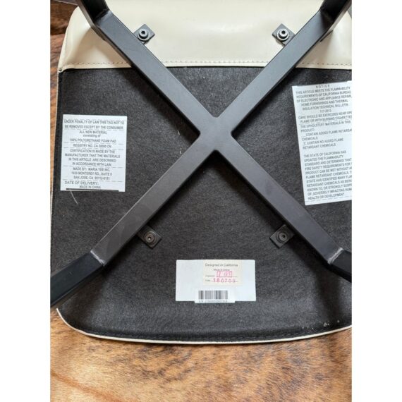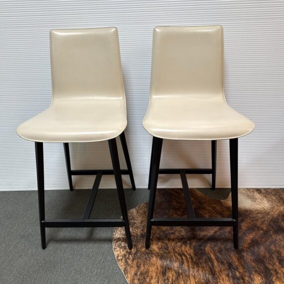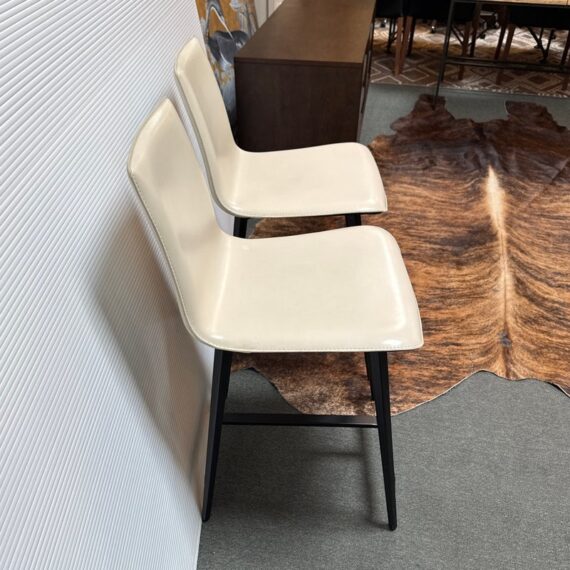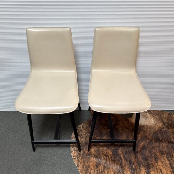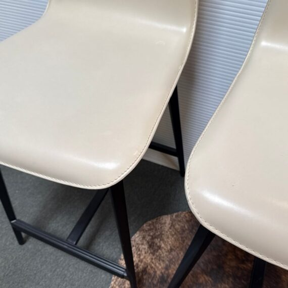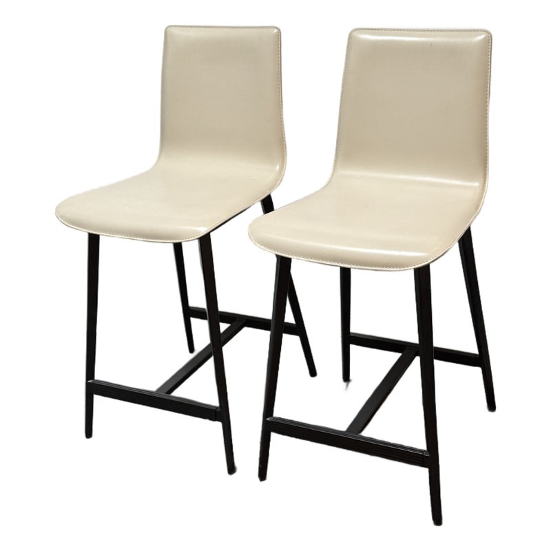 Design Plus Gallery presents a Pair of Counter Stools from Maria Yee. Improved classic joinery, innovative material, and modern engineering. The artistic merit of Maria Yee’s furniture goes beyond beautiful lines and elegant shapes. Maria refined these traditional techniques to create the proprietary breathing joinery system tailored to a modern manufacturing environment. The cream colored stools with blackened steel are both in good condition for their usage, minor visible surface wear.