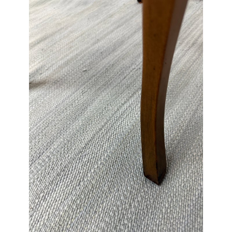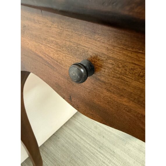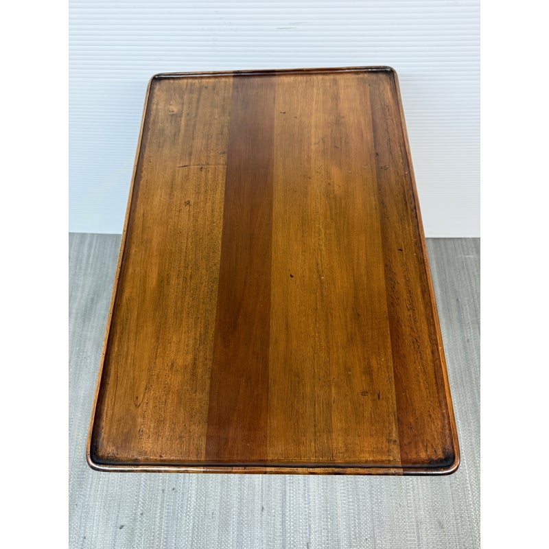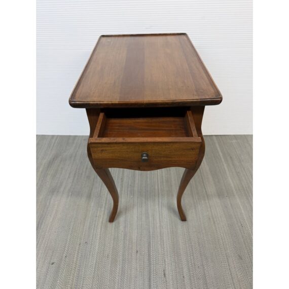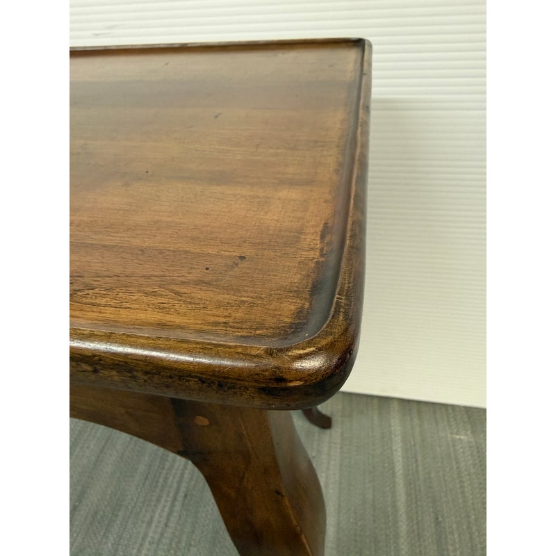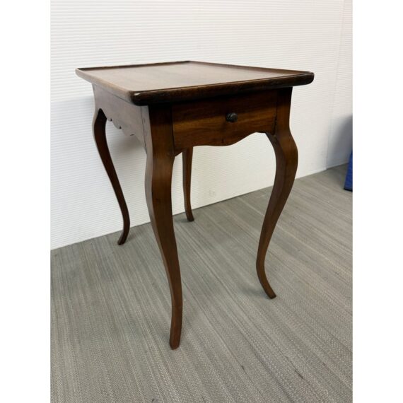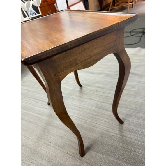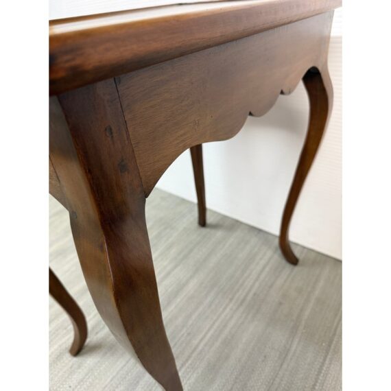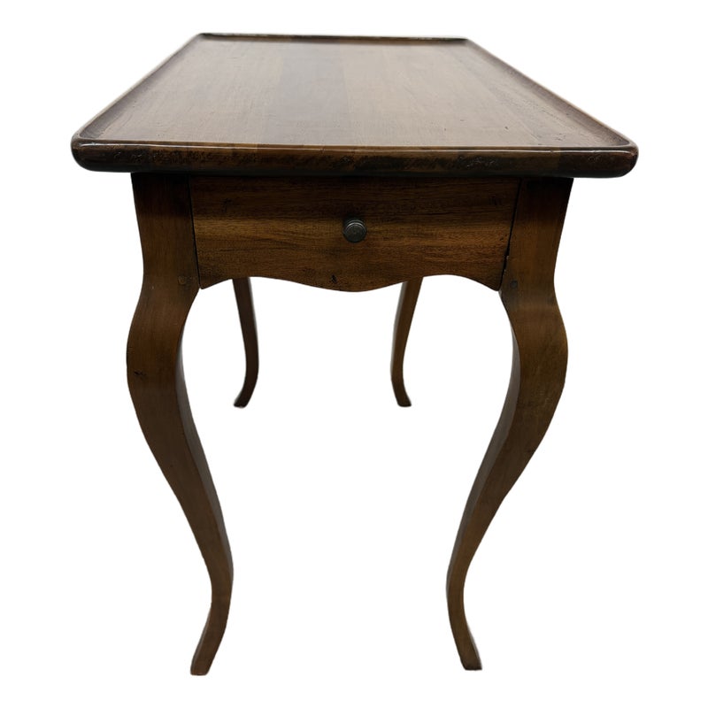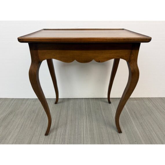Design Plus Gallery presents an Antique Louis XV Tea Table from Marie Albert. This timeless designed walnut table features an elegant scalloped apron, raised, rim edge and slender cabriole legs have a gentle taper which imparts a graceful uniqueness. A single shallow drawer with brass knob runs the depth of the piece. Light surface wear; condition is good for age an use.