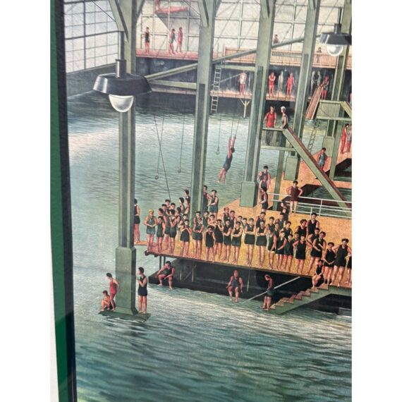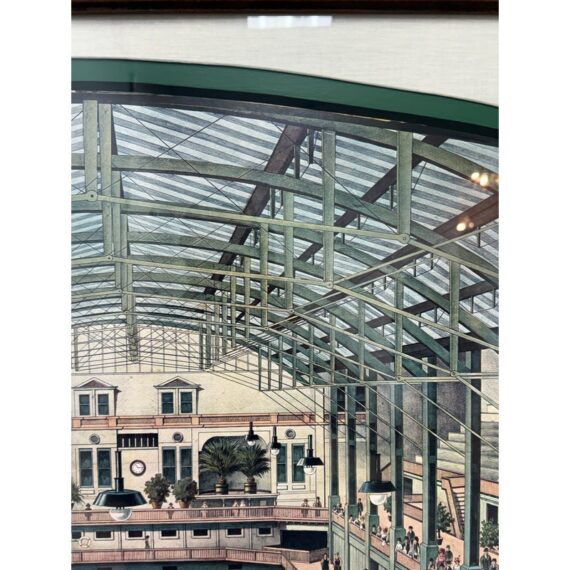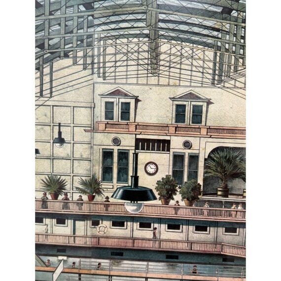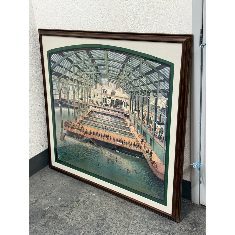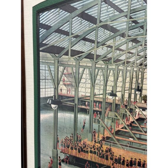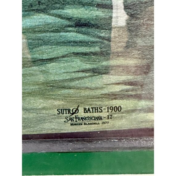 Design Plus Gallery presents Sutro Baths 1900, San Fransisciana by Marilyn Blaisdell. The work is an offset print from pictures that she maintained as a historian of San Francisco history. Marilyn Blaisdell (1928–2016) was a prominent historian and collector dedicated to preserving the visual history of San Francisco, particularly the Sutro Baths. Her work serves as a primary archival resource for the landmark’s 1894 opening through its destruction by fire in 1966. She produced iconic posters and art prints, such as this widely recognized “Sutro Baths 1900” print, which captures the massive glass-and-steel structure in its prime. The piece is in good condition as encased in a natural wood frame.