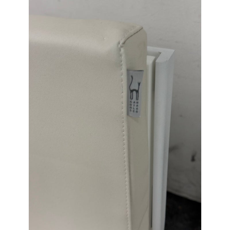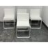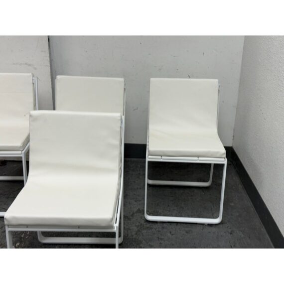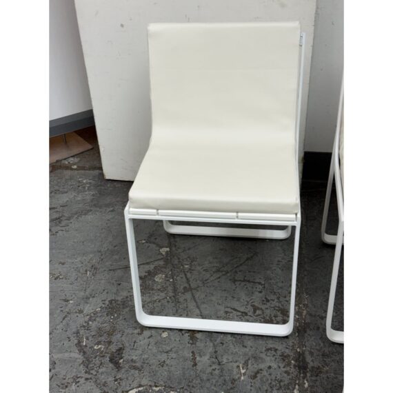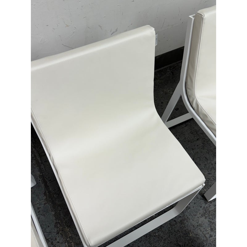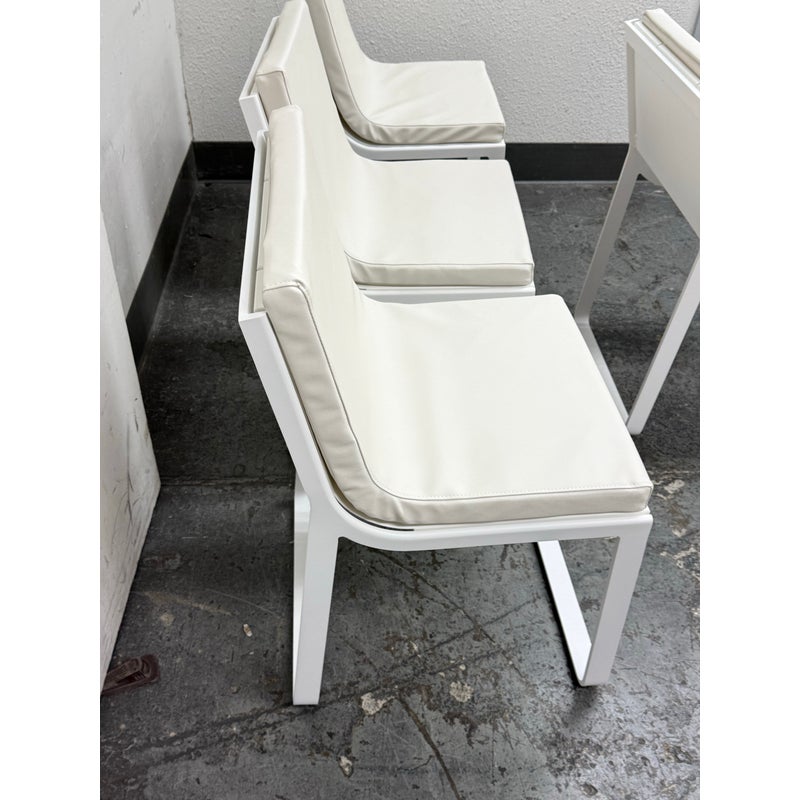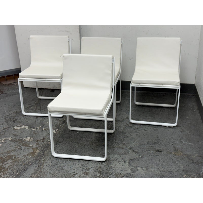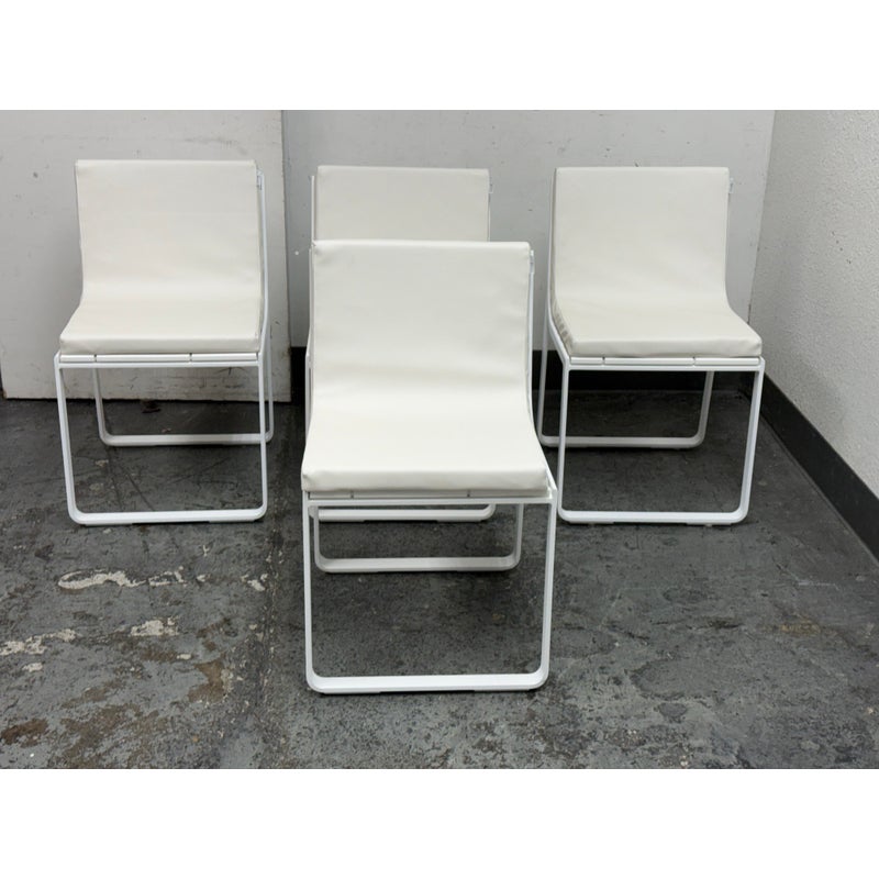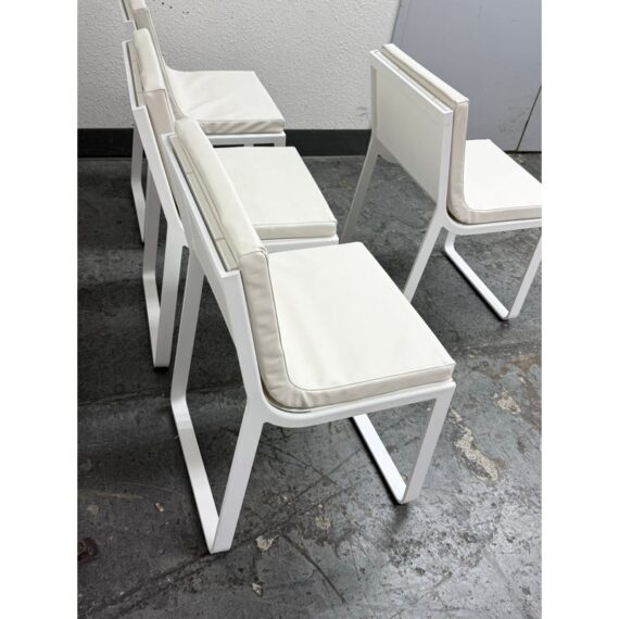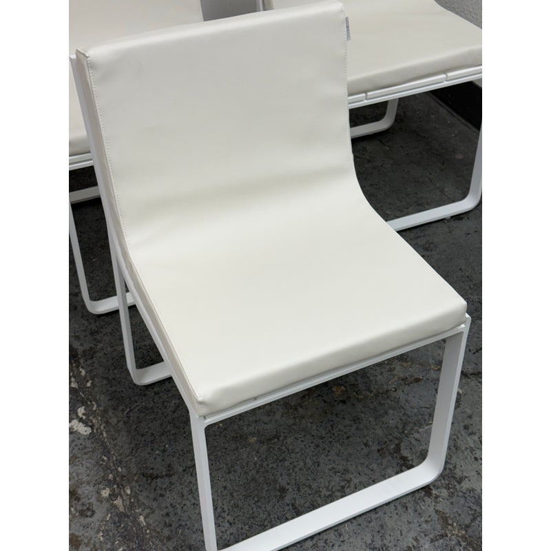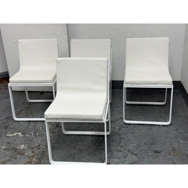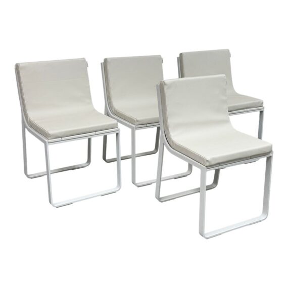 Design Plus Gallery presents a Set of Four FLAT In/Outdoor Dining Chairs from Designed by Mario Ruiz for Gandia Blasco. These true minimalist forms have a slender-profile and well-proportioned frames that are characterized by their sled bases with beautifully articulated, curved corners – the resulting range of furniture is infused with levity. The FLAT dining chairs are composed of thermo-lacquered, welded aluminum and polyethylene with a seat + back cushion is composed of polyurethane foam rubber covered in a removable water-repellent textile. Both the frame + upholstery are in stark white. They are in good condition for their usage with minimal visible surface wear. Made in Spain.