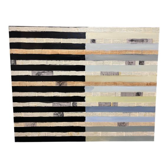 Design plus Gallery presents a Large Scale Collage Artwork by Artist/Designer Marius Duvalle. The layers are very captivating as it has stripes of newspaper strips placed between stripes of pastels on one side and black on the other. Very provocative piece. Is in good condition.