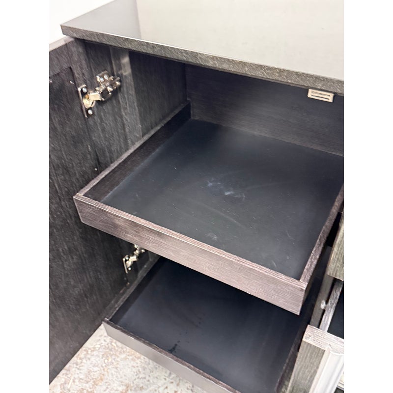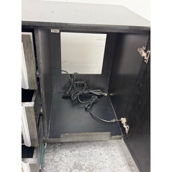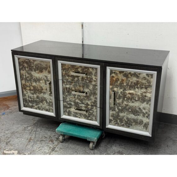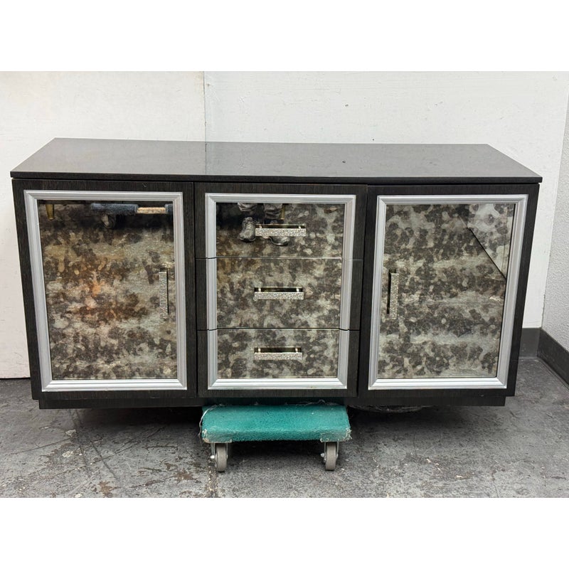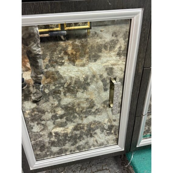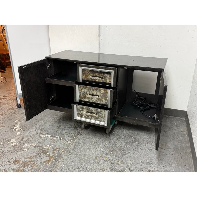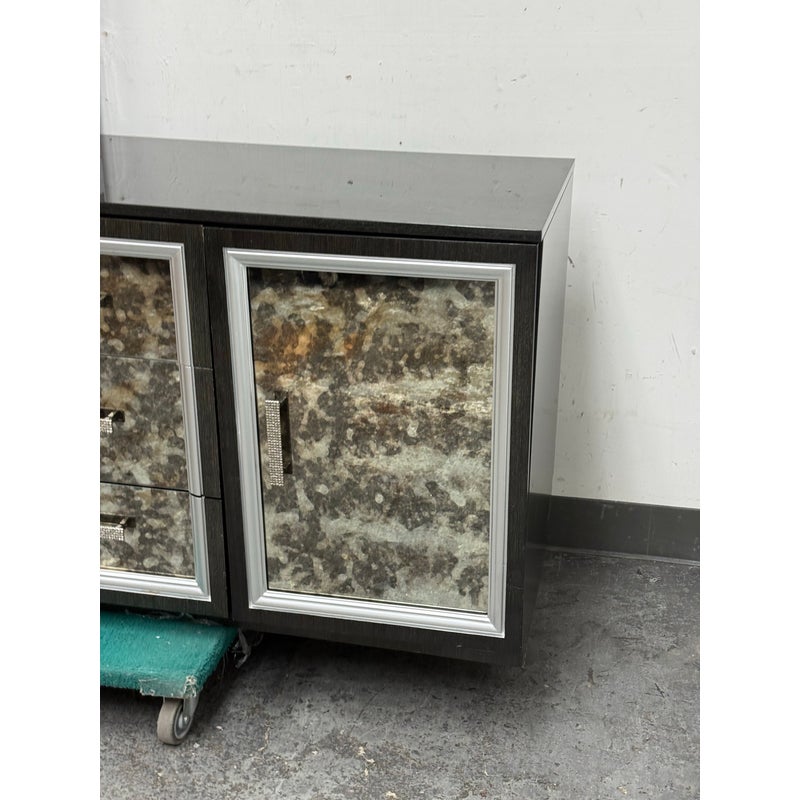 Design Plus Gallery presents a Custom Media Cabinet from Mark David. This substantial case piece pairs a linear woodgrain case with antiqued mirrored drawer and door fronts, each outlined by silver-toned molding. The composition includes two side cabinets, three central drawers, textured metal pulls, and an integrated rear power connection with interior cord access. The overall look combines reflective surfaces with tailored detailing and a bold geometric profile. This is a discontinued model from the brand and is in good condition with visible and minimal wear from usage.