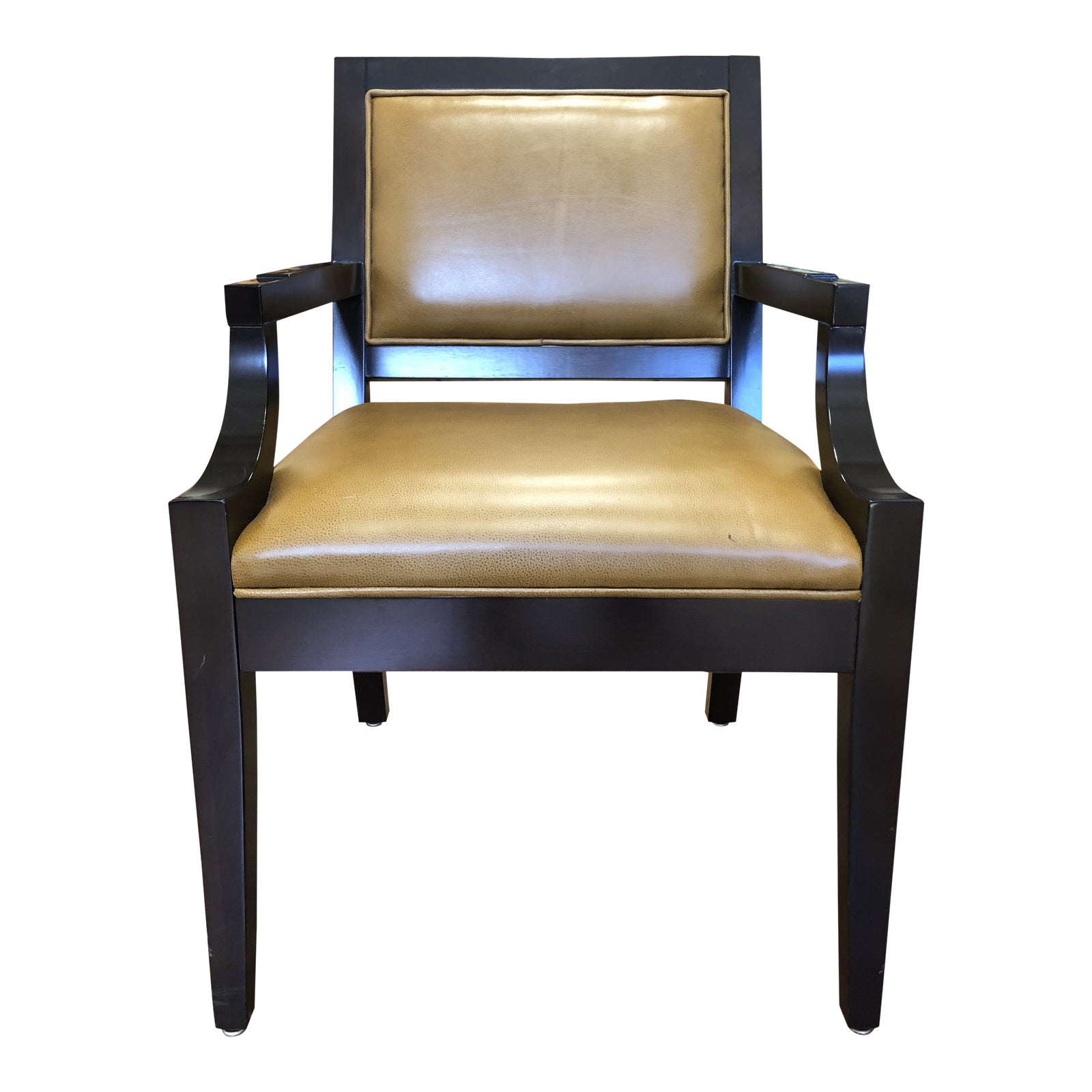 Design Plus Gallery presents a custom dining chairs by Mark David. Rich carmel leather (fabric backed) is beautifully framed with espresso stained wood, creating an inviting and comfortable spot to enjoy friends and meals. Scale works as movable side chairs, office chairs or game table seating. Arm Height 25.75 inches, Seat Height 19 inches.