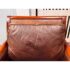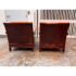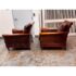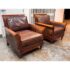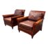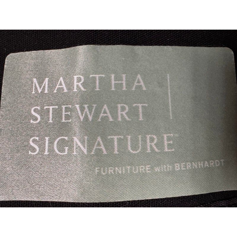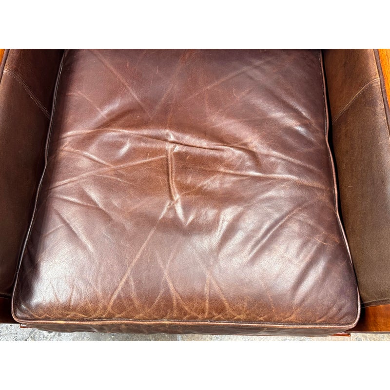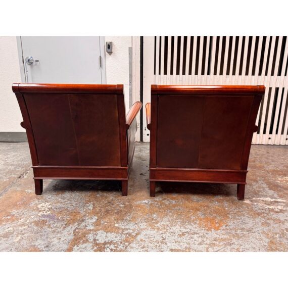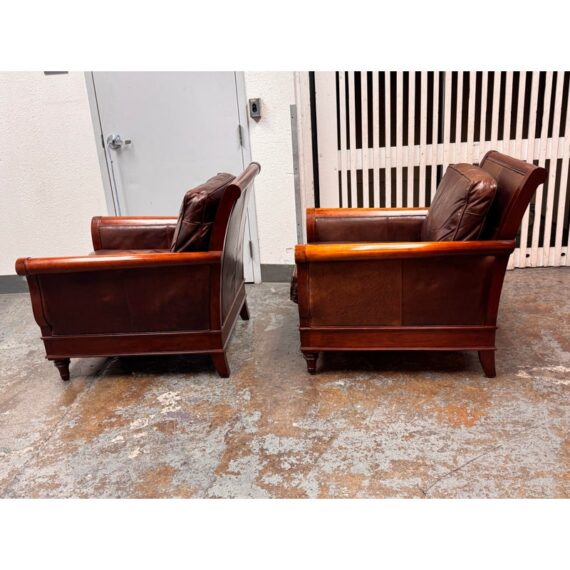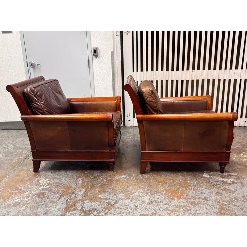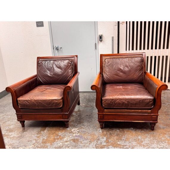 Design Plus Gallery presents a Pair of Lounge Armchairs by Martha Stewart Signature for Bernhardt. Framed in wood with rolled arms and upholstered in distressed brown leather, the chairs show the collection’s classic profile and generous scale. The leather cushions and paneled sides carry visible natural creasing and wear consistent with age and use, while the wood frames show areas of discoloration from usage. They are discontinued models from the brand and are in good condition with visible and minimal wear from usage.