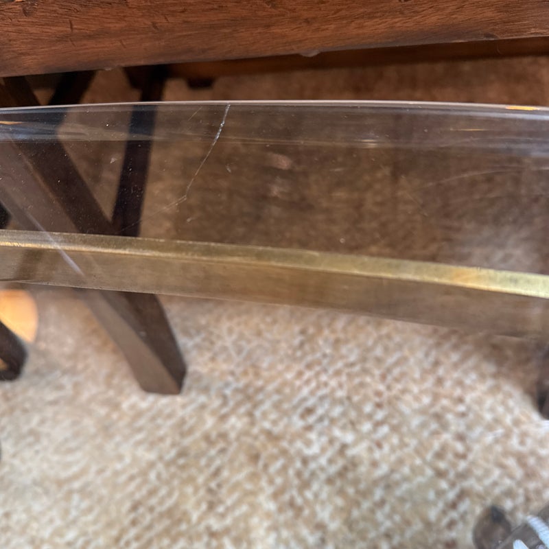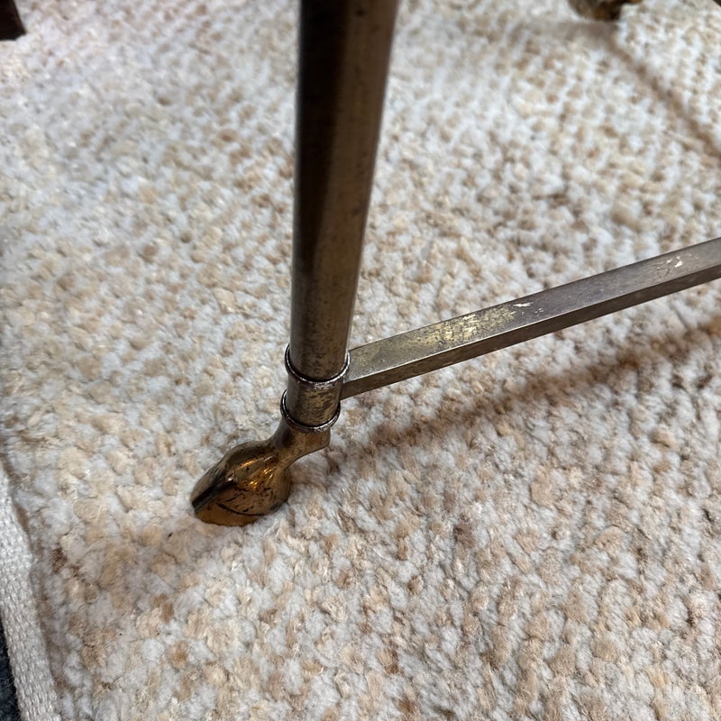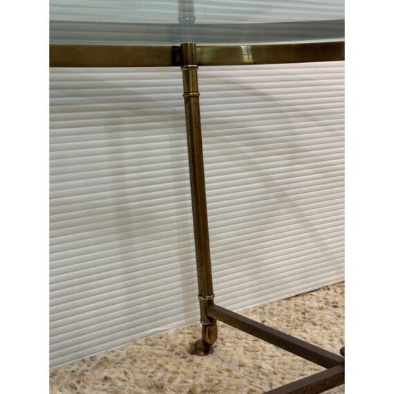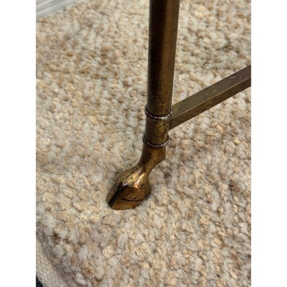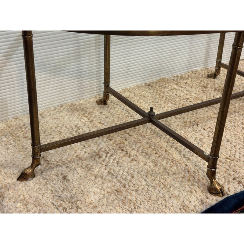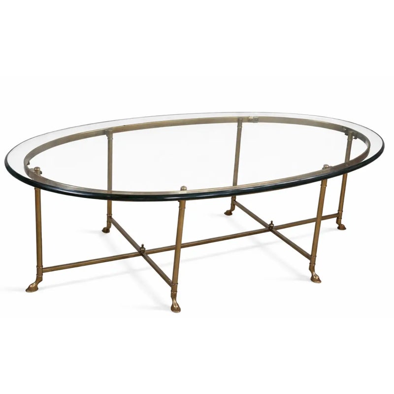 Design Plus Gallery presents a Mastercraft Style Brass Coffee Table. The table has hoof feet with a thick racetrack glass top. The base shows a well-aged patina, and the oval heavy glass top is beveled. This table is craftsmanship pure and is a great addition to any interior design. It is in good overall condition for its usage with patina to the metal and small scratches to the glass.